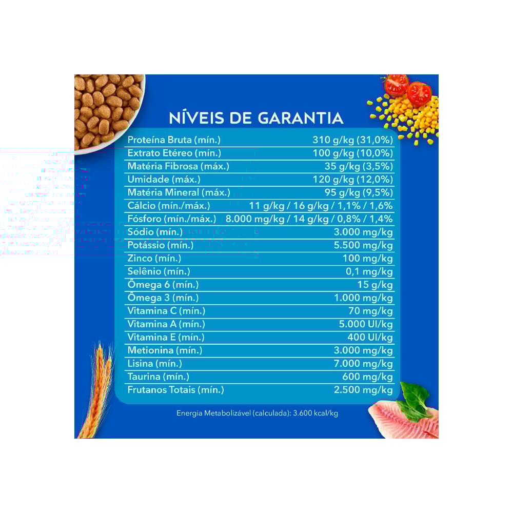 Níveis de Garantia Umidade (máx.).................................. 120 g/kg (12,0%) Proteína Bruta (mín.).......................... 310 g/kg (31,0%) Extrato Etéreo (mín.)............................ 90 g/kg (9,0%) Matéria Fibrosa (máx.)......................... 35 g/kg (3,5%) Matéria Mineral (máx.)......................... 95 g/kg (9,5%) Cálcio (mín. / máx.)................11 g/kg / 16 g/kg (1,1% / 1,6%) Fósforo (mín. / máx.)......8.000 mg/kg / 14 g/kg (0,8% / 1,4%) Potássio (mín.).............................6.000 mg/kg Sódio (mín.)……………..………...3.000 mg/kg Magnésio (mín) ............................. 800 mg/kg Zinco (mín.).................................... 140 mg/kg Selênio (mín.).................................. 0,1 mg/kg Lisina (mín.)................................. 9.500 mg/kg Metionina (mín.)........................... 5.900 mg/kg Taurina (mín.).............................. 1.100 mg/kg Vitamina A (mín.)......................... 10.000 UI/kg Vitamina C (mín.).............................. 70 mg/kg Vitamina E (mín.)...............................400 UI/kg Frutanos Totais (Mín) ………...... 3.000 mg/kg Ômega 6 (mín.)………………..........… 15 g/kg Ômega 3 (mín.)………………...... 1.200 mg/kg Energia Metabolizável: 3.750 kcal/kg Composição Composição básica: grão de milho*, trigo integral, farinha de atum, farinha de carne e osso de suínos, farinha de vísceras de aves, farinha hidrolisada de aves, farelo de glúten de milho (60)*, farelo de soja*, gordura suína, espinafre desidratado, tomate, cloreto de sódio, carbonato de cálcio, ácido fosfórico, inulina, pirofosfato tetrassodico (mín. 0,5%), cloreto de potássio, hidrolisado de fígado de aves e suínos, DL- metionina, L-Lisina, taurina, biomassa de microalgas (Schizochytrium sp.), levedura de cerveja inativada desidratada, vitaminas (retinol, colecalciferol, acetato de D-alfa-tocoferol, ácido ascórbico, menadiona bissulfito de nicotinamida, tiamina, riboflavina, niacina (ácido nicotínico), D-pantotenato de cálcio, piridoxina, biotina, ácido fólico, cianocobalamina, cloreto de colina), minerais (sulfato de zinco monohidratado, sulfato ferroso monohidratado, sulfato de manganês monohidratado, sulfato de cobre pentahidratado, iodato de cálcio, selenito de sódio) e BHT. Eventuais Substitutivos: grão de sorgo, farelo de glúten de milho (21)*, hidrolisado de fígado desidratado de aves, hidrolisado de fígado desidratado de suínos, farinha de carne e osso de bovinos, farinha de salmão, farinha de peixes, farinha de pena hidrolisada, quirera de arroz, gordura de frango, fosfato bicálcico, levedura de cana de açúcar inativada e desidratada. *Ingredientes transgênicos. Espécies doadoras do gene: Agrobacterium tumefaciens, Bacillus thuringiensis, Streptomyces viridochromogenes e Zea mays Cuidados