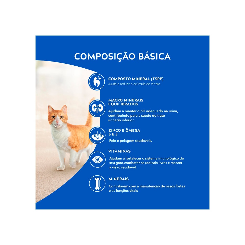 - Indicada para gatos a partir de 12 meses; - Ração sabor peixe; - Fórmula desenvolvida com os nutrientes adequados que o seu gato precisa; - Alimento premium, especialmente elaborado para gatos a partir de 1 ano; - 100% completo e balanceado; - Rico em proteínas, vitaminas e contém ferro para ajudar a manter os músculos fortes; - Possui a tecnologia Defense Plus, que conta com Ômega 6 e 3 na composição; - Sem corantes; - Possui uma combinação exclusiva de antioxidantes que ajudam manter o seu gato mais saudável; - Tem um ótimo equilíbrio de minerais e aminoácidos, contribuindo para a saúde do trato urinário;