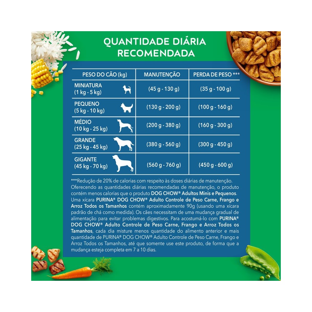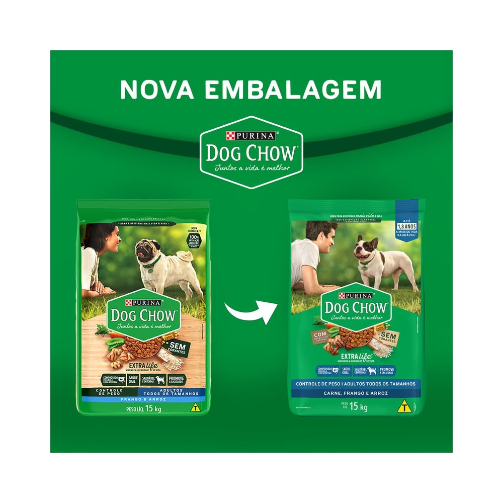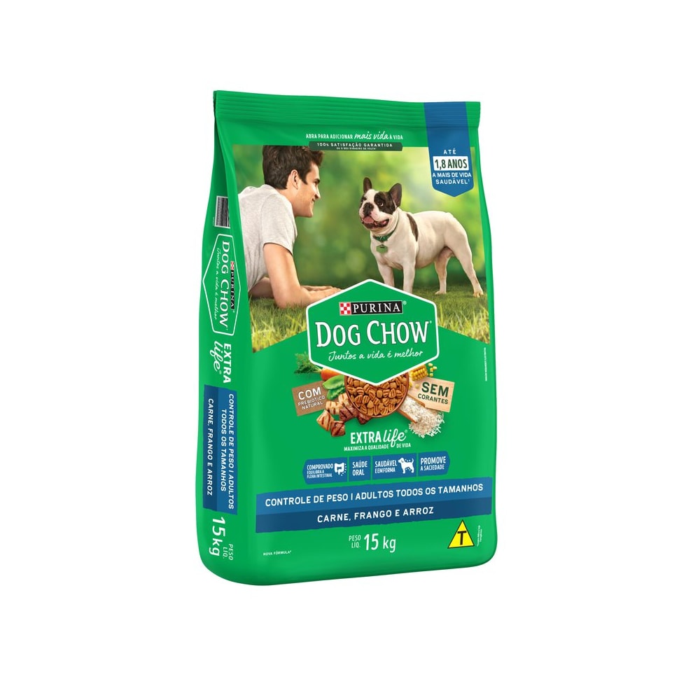 Detalhes do Produto A Ração PURINA® DOG CHOW® Controle de Peso é um alimento 100% completo e balanceado destinado a cães adultos com sobrepeso. Todos os produtos agora apresentam ExtraLife®, um mix de antioxidantes, vitaminas e minerais, que ajuda a maximizar a qualidade de vida do seu cão dia após dia. Sabemos que seu pet é um membro especial da família e, por essa razão, nós nos importamos com a sua saúde, cuidado e bem-estar. 100% completo e balanceado, um alimento com multivitaminas e minerais, nutrientes essenciais para o bom funcionamento do metabolismo e que auxiliam o seu pet a ter saúde e vitalidade.