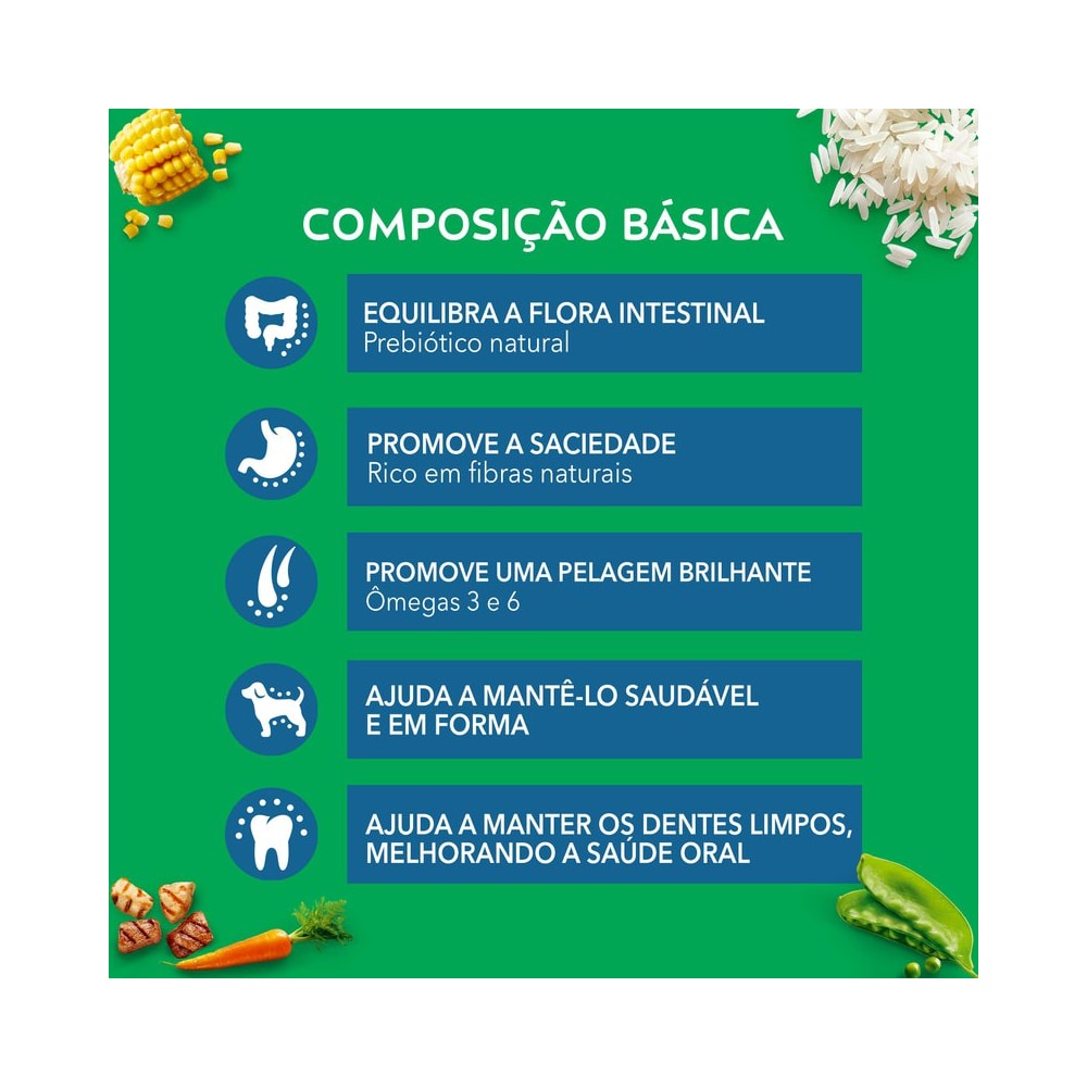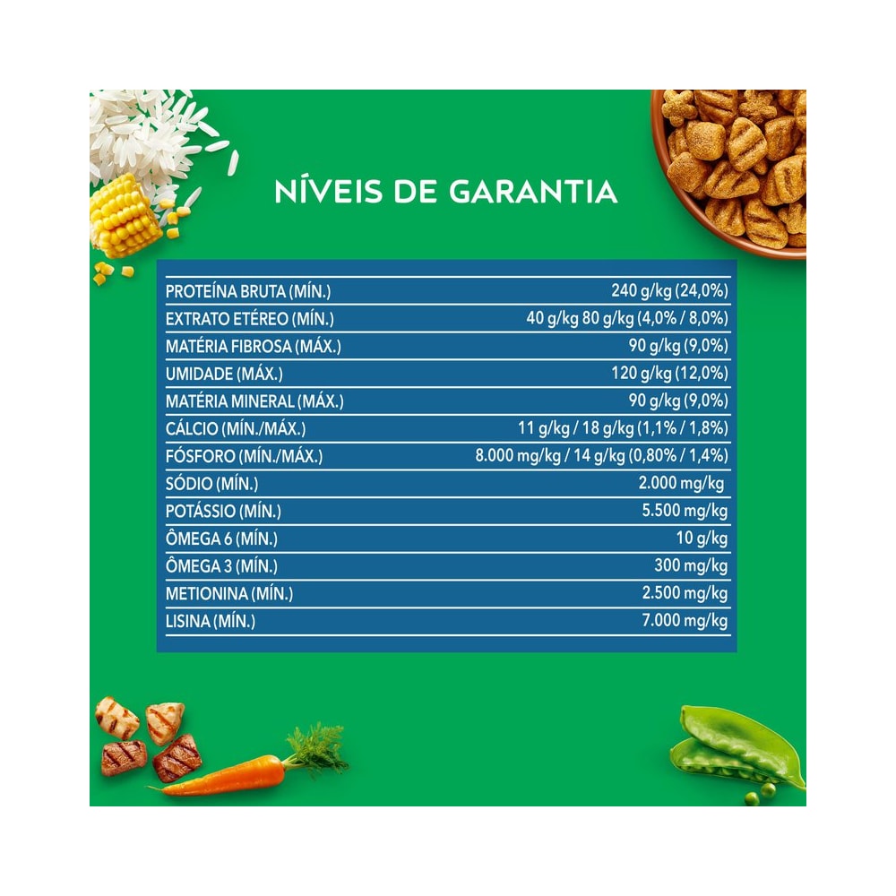 Composiçao básica: Grão de milho*, farinha de carne e osso de suínos, farinha de vísceras de aves, farinha de atum, farelo de soja*, farelo de glúten de milho (60)*, quirera de arroz, casca de soja*, fibra de cana de açúcar, gordura de frango, hidrolisado de fígado de aves e suínos, cloreto de sódio, inulina, cloreto de potássio, carbonato de cálcio, cenoura, ervilha moída desidratada, DL-metionina, L-Lisina, vitaminas (retinol, colecalciferol, acetato de D-alfa-tocoferol, menadiona bissulfito de sódio, tiamina, riboflavina, niacina (ácido nicotínico), D-pantotenato de cálcio, cloridrato de piridoxina, biotina, ácido fólico, cianocobalamina, cloreto de colina), minerais (sulfato de zinco monohidratado, sulfato ferroso monohidratado, sulfato de manganês monohidratado, sulfato de cobre pentahidratado, iodato de cálcio, selenito de sódio, proteinato de cobre, proteinato de ferro, proteinato de manganês, proteinato de selênio, proteinato de zinco) e BHT. Eventuais Substitutivos: farinha de carne e osso de bovinos, farinha de salmão, farinha de peixes, farinha de sardinha, farinha de tilápia, farinha hidrolisada de aves, grão de sorgo, trigo integral, farelo de glúten de milho (21)*, gordura suína, fosfato bicálcico, biomassa de microalgas (Schizochtrium sp.), hidrolisado de fígado desidratado de aves, hidrolisado de fígado desidratado de suínos, farinha de pena hidrolisada, triguilho, grão de triticale e milheto. 2Nova Fórmula: Alteração de Proteína Bruta (mín.) de 260 g/kg para 240 g/kg, Fósforo (máx.) de 13 g/kg para 14 g/kg, Frutanos Totais de 3.000 mg/kg para 2.500 mg/kg.