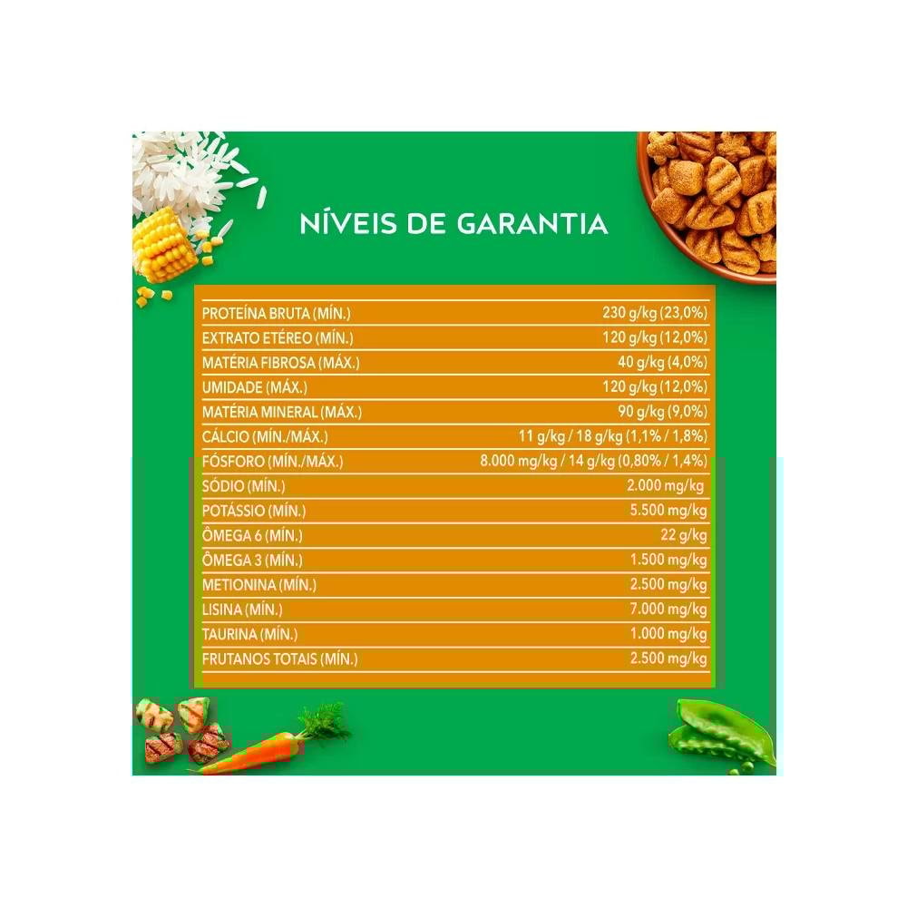Grão de milho*, farinha de carne e osso de suínos, farinha de vísceras de aves, farinha de atum, farelo de soja*, farelo de glúten de milho (60)*, quirera de arroz, casca de soja*, gordura de frango, hidrolisado de fígado de aves e suínos, cloreto de sódio, zeolita, inulina, cloreto de potássio, carbonato de cálcio, cenoura, ervilha moída desidratada, DL-metionina, L-Lisina, taurina, vitaminas (retinol, colecalciferol, acetato de D-alfa-tocoferol, menadiona bissulfito de sódio, tiamina, riboflavina, niacina (ácido nicotínico), D-pantotenato de cálcio, cloridrato de piridoxina, biotina, ácido fólico, cianocobalamina, cloreto de colina), minerais (sulfato de zinco monohidratado, sulfato ferroso monohidratado, sulfato de manganês monohidratado, sulfato de cobre pentahidratado, iodato de cálcio, selenito de sódio, proteinato de cobre, proteinato de ferro, proteinato de manganês, proteinato de selênio, proteinato de zinco) e BHT. Eventuais Substitutivos: farinha de carne e osso de bovinos, farinha de salmão, farinha de peixes, farinha de sardinha, farinha de tilápia, farinha hidrolisada de aves, grão de sorgo, trigo integral, farelo de glúten de milho (21)*, gordura suína, fosfato bicálcico, biomassa de microalgas (Schizochtrium sp.), hidrolisado de fígado desidratado de aves, hidrolisado de fígado desidratado de suínos, farinha de pena hidrolisada, triguilho, grão de triticale e milheto.