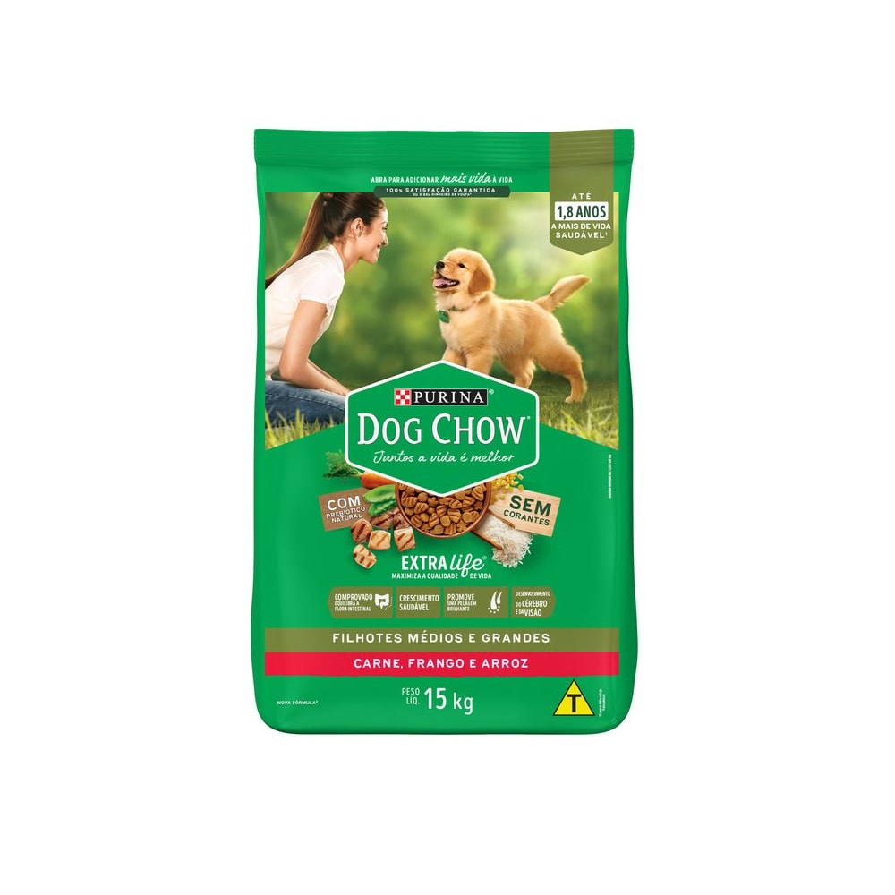 Ração Dog Chow para Cães Filhotes de Raças Médias e Grandes Sabor Carne, Frango e Arroz 15kg