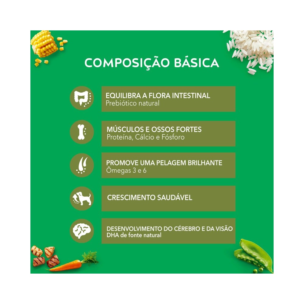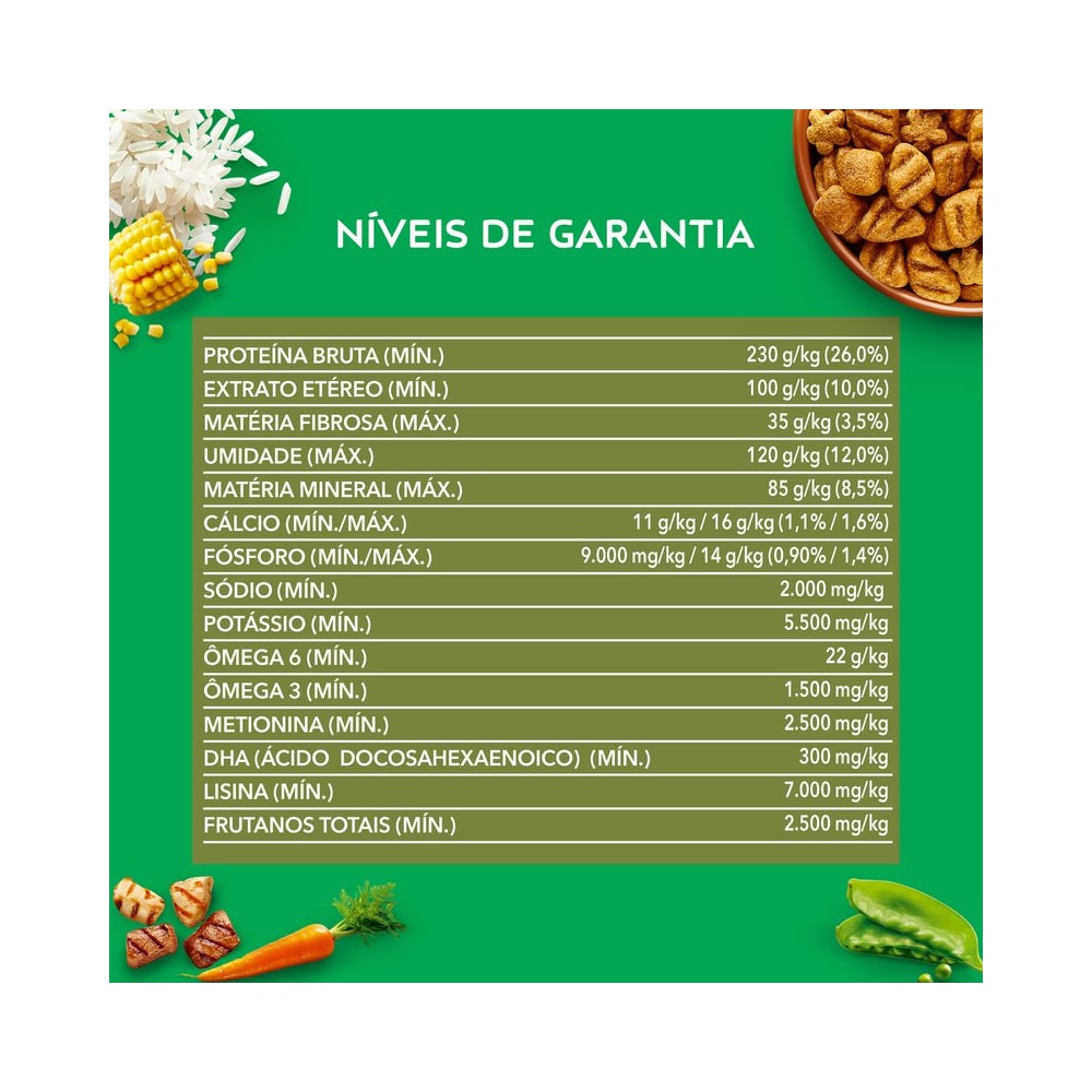 Composição básica: Grão de milho*, farinha de carne e osso de suínos, farinha de vísceras de aves, farinha de atum, farelo de soja*, farelo de glúten de milho (60)*, quirera de arroz, casca de soja*, gordura de frango, hidrolisado de fígado de aves e suínos, cloreto de sódio, inulina, cloreto de potássio, carbonato de cálcio, cenoura, ervilha moída desidratada, DL-metionina, L-Lisina, vitaminas (retinol, colecalciferol, acetato de D-alfa-tocoferol, ácido ascórbico, menadiona bissulfito de sódio, tiamina, riboflavina, niacina (ácido nicotínico), D-pantotenato de cálcio, cloridrato de piridoxina, biotina, ácido fólico, cianocobalamina, cloreto de colina), minerais (sulfato de zinco monohidratado, sulfato ferroso monohidratado, sulfato de manganês monohidratado, sulfato de cobre pentahidratado, iodato de cálcio, selenito de sódio, proteinato de cobre, proteinato de ferro, proteinato de manganês, proteinato de selênio, proteinato de zinco) e BHT. Eventuais Substitutivos: farinha de carne e osso de bovinos, farinha de salmão, farinha de peixes, farinha de sardinha, farinha de tilápia, farinha hidrolisada de aves, grão de sorgo, trigo integral, farelo de glúten de milho (21)*, gordura suína, fosfato bicálcico, biomassa de microalgas (Schizochtrium sp.), hidrolisado de fígado desidratado de aves, hidrolisado de fígado desidratado de suínos, farinha de pena hidrolisada, triguilho, grão de triticale e milheto..²Nova Fórmula: Inclusão de casca de soja, exclusão de corantes artificiais e zeolita, alteração de frutanos totais (mín.) de 3.000 mg/kg para 2.500 mg/kg, Proteína Bruta (mín.) de 270 g/kg para 260 g/kg, Extrato Etéreo (mín.) de 140 g/kg para 100 g/kg, Matéria Fibrosa (máx.) de 30 g/kg para 35 g/kg, Máteria Mineral (máx.) de 90 g/kg para 85 g/kg, Cálcio (mín.) de 10 g/kg para 11 g/kg, Fósforo (máx.) de 13 g/kg para 14 g/kg, Sódio (mín.) de 3.000 mg/kg para 2.000 mg/kg.