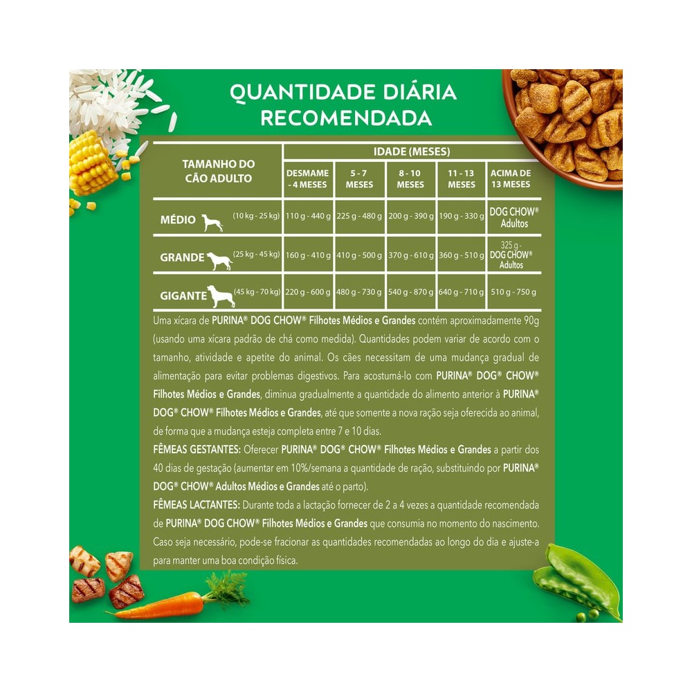 Orientação para introdução ao animal: Uma xícara de PURINA® DOG CHOW ® Filhotes contém aproximadamente 90g (usando uma xícara padrão de chá como medida). Quantidades podem variar de acordo com o tamanho, atividade e apetite do animal. Os cães necessitam de uma mudança gradual de alimentação para evitar problemas digestivos. Para acostumá-lo com PURINA® DOG CHOW ® Filhotes, cada dia misture menos quantidade do alimento anterior e mais quantidade de PURINA® DOG CHOW ® Filhotes , até que somente use este produto, de forma que a mudança esteja completa em 7 a 10 dias.