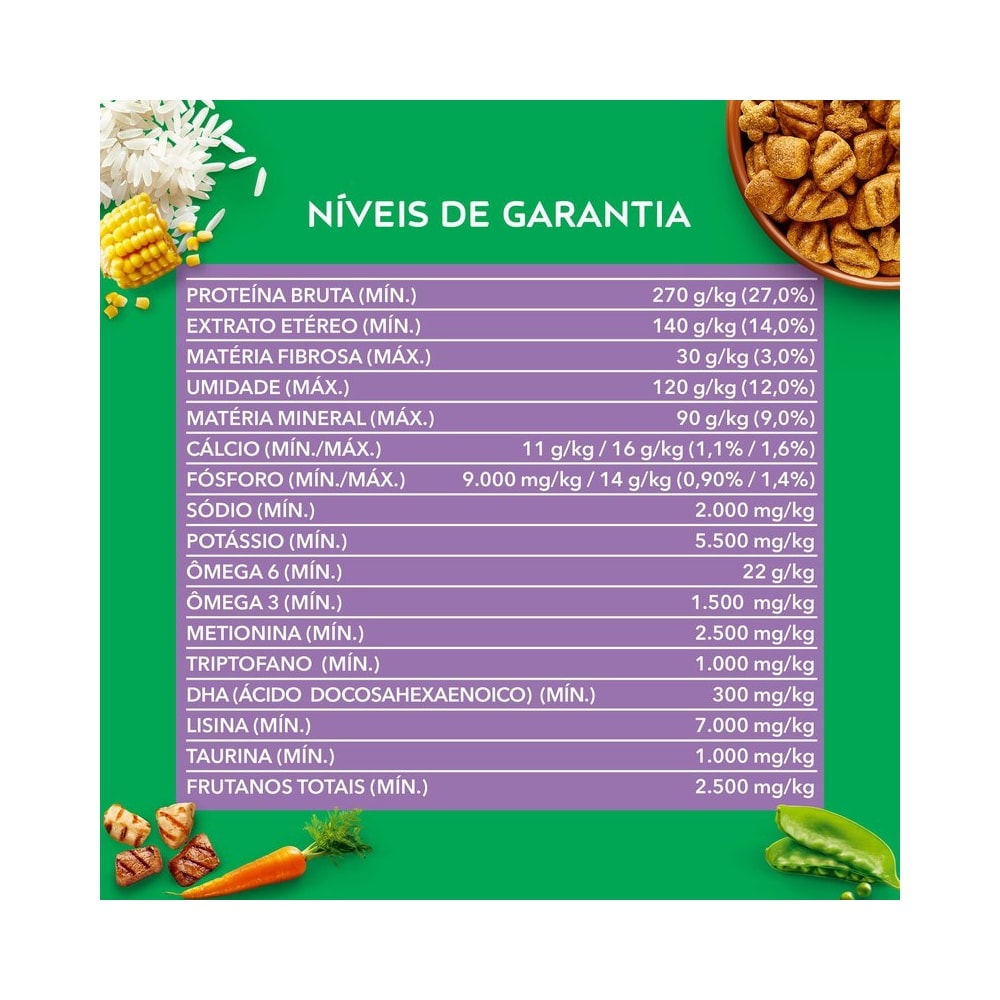 Composição básica: Grão de milho*, farinha de carne e osso de suínos, farinha de vísceras de aves, farinha de atum, farelo de soja*, farelo de glúten de milho (60)*, quirera de arroz, casca de soja, gordura de frango, hidrolisado de fígado de aves e suínos, cloreto de sódio, inulina, cloreto de potássio, carbonato de cálcio, cenoura, ervilha moída desidratada, DL-metionina, L-Lisina, taurina, L-triptofano, vitaminas (retinol, colecalciferol, acetato de D-alfa-tocoferol, ácido ascórbico, menadiona bissulfito de sódio, tiamina, riboflavina, niacina (ácido nicotínico), D-pantotenato de cálcio, cloridrato de piridoxina, biotina, ácido fólico, cianocobalamina, cloreto de colina), minerais (sulfato de zinco monohidratado, sulfato ferroso monohidratado, sulfato de manganês monohidratado, sulfato de cobre pentahidratado, iodato de cálcio, selenito de sódio, proteinato de cobre, proteinato de ferro, proteinato de manganês, proteinato de selênio, proteinato de zinco) e BHT. Eventuais Substitutivos: farinha de carne e osso de bovinos, farinha de salmão, farinha de peixes, farinha de sardinha, farinha de tilápia, farinha hidrolisada de aves, grão de sorgo, trigo integral, farelo de glúten de milho (21)*, gordura suína, fosfato bicálcico, biomassa de microalgas (Schizochtrium sp.), hidrolisado de fígado desidratado de aves, hidrolisado de fígado desidratado de suínos, farinha de pena hidrolisada, triguilho, grão de triticale e milheto.²Nova Fórmula: Inclusão de L-Triptofano e alteração de Cálcio (mín.) de 10g/kg para 11g/kg, Fósforo (máx.) de 13g/kg para 14g/kg, Sódio (mín.) de 3.000 mg/kg para 2.000 mg/kg, Frutanos Totais (mín.) de 3.000 mg/kg para 2.500 mg/kg.