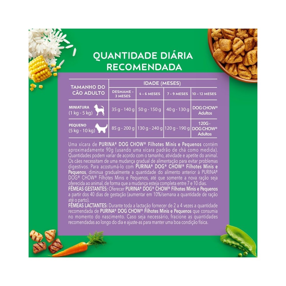 Orientação para introdução ao animal: Uma xícara de PURINA® DOG CHOW ® Filhotes Saúde Visível Mini e Pequenos contém aproximadamente 90g (usando uma xícara padrão de chá como medida). Quantidades podem variar de acordo com o tamanho, atividade e apetite do animal. Os cães necessitam de uma mudança gradual de alimentação para evitar problemas digestivos. Para acostumá-lo com PURINA® DOG CHOW ® Filhotes Saúde Visível Mini e Pequenos, cada dia misture menos quantidade do alimento anterior e mais quantidade de PURINA® DOG CHOW ® Filhotes Saúde Visível Mini e Pequenos, até que somente use este produto, de forma que a mudança esteja completa em 7 a 10 dias.
