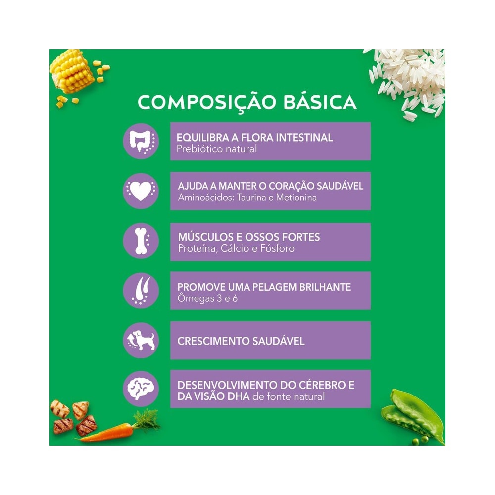 Composição básica: Grão de milho*, farinha de carne e osso de suínos, farinha de vísceras de aves, farinha de atum, farelo de soja*, farelo de glúten de milho (60)*, quirera de arroz, casca de soja, gordura de frango, hidrolisado de fígado de aves e suínos, cloreto de sódio, inulina, cloreto de potássio, carbonato de cálcio, cenoura, ervilha moída desidratada, DL-metionina, L-Lisina, taurina, L-triptofano, vitaminas (retinol, colecalciferol, acetato de D-alfa-tocoferol, ácido ascórbico, menadiona bissulfito de sódio, tiamina, riboflavina, niacina (ácido nicotínico), D-pantotenato de cálcio, cloridrato de piridoxina, biotina, ácido fólico, cianocobalamina, cloreto de colina), minerais (sulfato de zinco monohidratado, sulfato ferroso monohidratado, sulfato de manganês monohidratado, sulfato de cobre pentahidratado, iodato de cálcio, selenito de sódio, proteinato de cobre, proteinato de ferro, proteinato de manganês, proteinato de selênio, proteinato de zinco) e BHT. Eventuais Substitutivos: farinha de carne e osso de bovinos, farinha de salmão, farinha de peixes, farinha de sardinha, farinha de tilápia, farinha hidrolisada de aves, grão de sorgo, trigo integral, farelo de glúten de milho (21)*, gordura suína, fosfato bicálcico, biomassa de microalgas (Schizochtrium sp.), hidrolisado de fígado desidratado de aves, hidrolisado de fígado desidratado de suínos, farinha de pena hidrolisada, triguilho, grão de triticale e milheto.²Nova Fórmula: Inclusão de L-Triptofano e alteração de Cálcio (mín.) de 10g/kg para 11g/kg, Fósforo (máx.) de 13g/kg para 14g/kg, Sódio (mín.) de 3.000 mg/kg para 2.000 mg/kg, Frutanos Totais (mín.) de 3.000 mg/kg para 2.500 mg/kg.