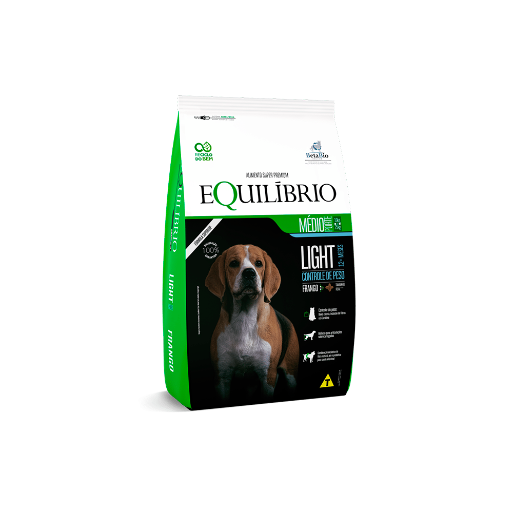 Descrição do produto A Ração Equilíbrio para Cachorro Adulto Light de Médio Porte Sabor Frango 12kg é um alimento Super Premium completo com opções para todas as fases da vida que entrega a mais sofisticada e atualizada nutrição através de dietas de alto desempenho, desenvolvidas para pets com diferentes portes e necessidades. A alta palatabilidade da linha agrada até os paladares mais exigentes. Alimento completo super premium para cães.