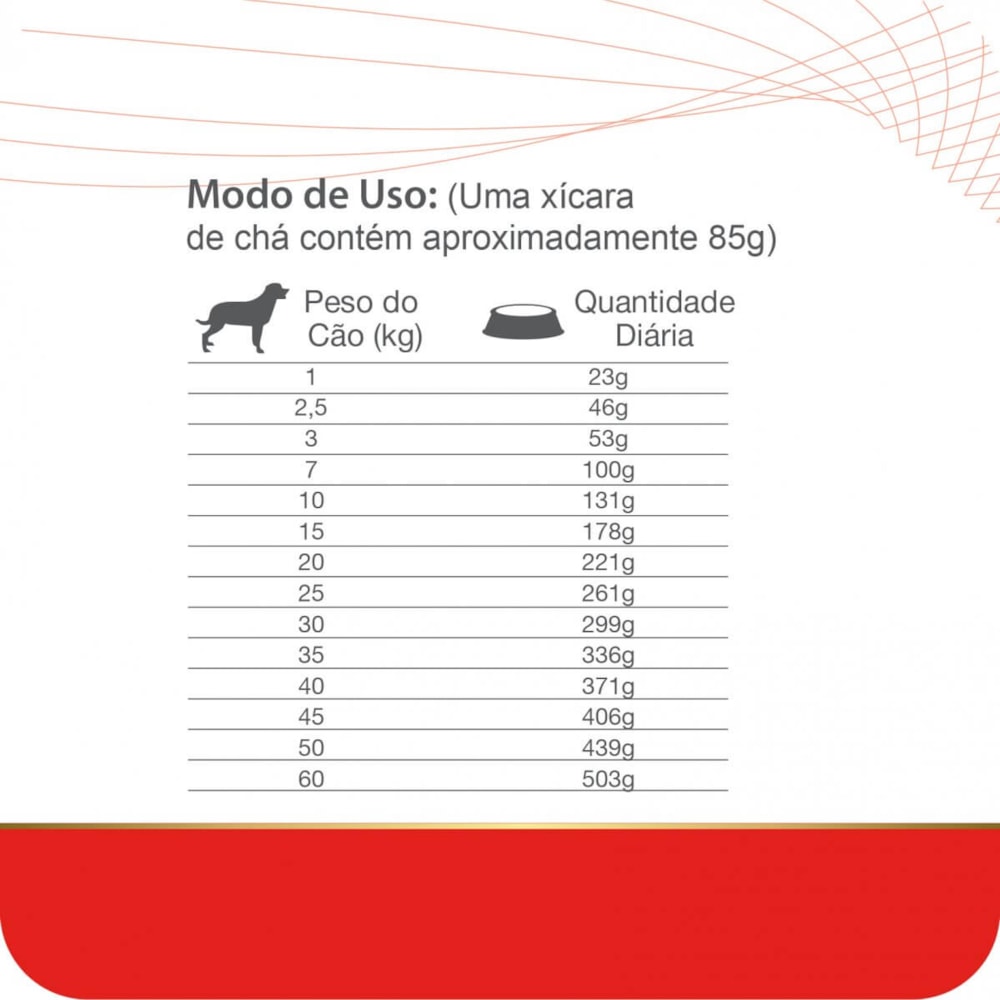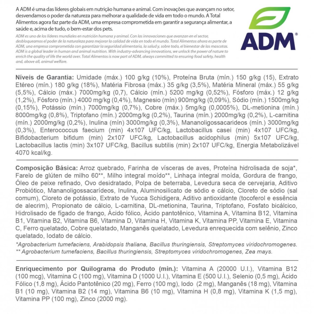 | Composição | Arroz quebrado, proteína hidrolisada de soja, farelo de glúten de milho-60, milho integral moído, semente de linhaça, gordura de frango, óleo de peixe refinado, polpa de beterraba, aditivo probiótico, mannanoligossacarídeos, inulina, cloreto de potássio, cloreto de sódio (sal comum), cloreto de colina, extrato de yucca schidigera, aditivo antioxidante (tocoferol e essência de alecrim), L-carnitina, DL-metionina, L-lisina, taurina, triptofano, fosfato bicálcico, ácido fólico, ácido pantotênico, betacaroteno, vitamina A, vitamina B12, vitamina B1, vitamina B2, vitamina B6, vitamina D, vitamina H, vitamina K, vitamina PP, vitamina E, vitamina C, ferro quelatado, cobre quelatado, manganês quelatado, levedura enriquecida com selênio, zinco quelatado, iodato de cálcio. |