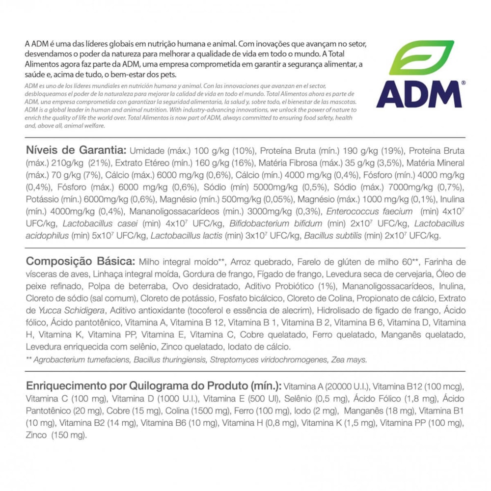 Milho integral moído**, arroz quebrado, farelo de glúten de milho-60**, farinha de vísceras de frango, semente de linhaça, gordura de frango, fígado de frango, óleo de peixe refinado, polpa de beterraba, ovo desidratado, aditivo probiótico (1%), mannanoligossacarídeos, inulina, cloreto de potássio, citrato de potássio, cloreto de colina, extrato de yucca schidigera, aditivo antioxidante (tocoferol e essência de alecrim), DL-metionina, taurina, triptofano, ácido fólico, ácido pantotênico, betacaroteno, vitamina A, vitamina B12, vitamina B1, vitamina B2, vitamina B6, vitamina D, vitamina H, vitamina K, vitamina PP, vitamina E, vitamina C, cobre quelatado, ferro quelatado, manganês quelatado, levedura enriquecida com selênio, zinco quelatado, iodato de cálcio.