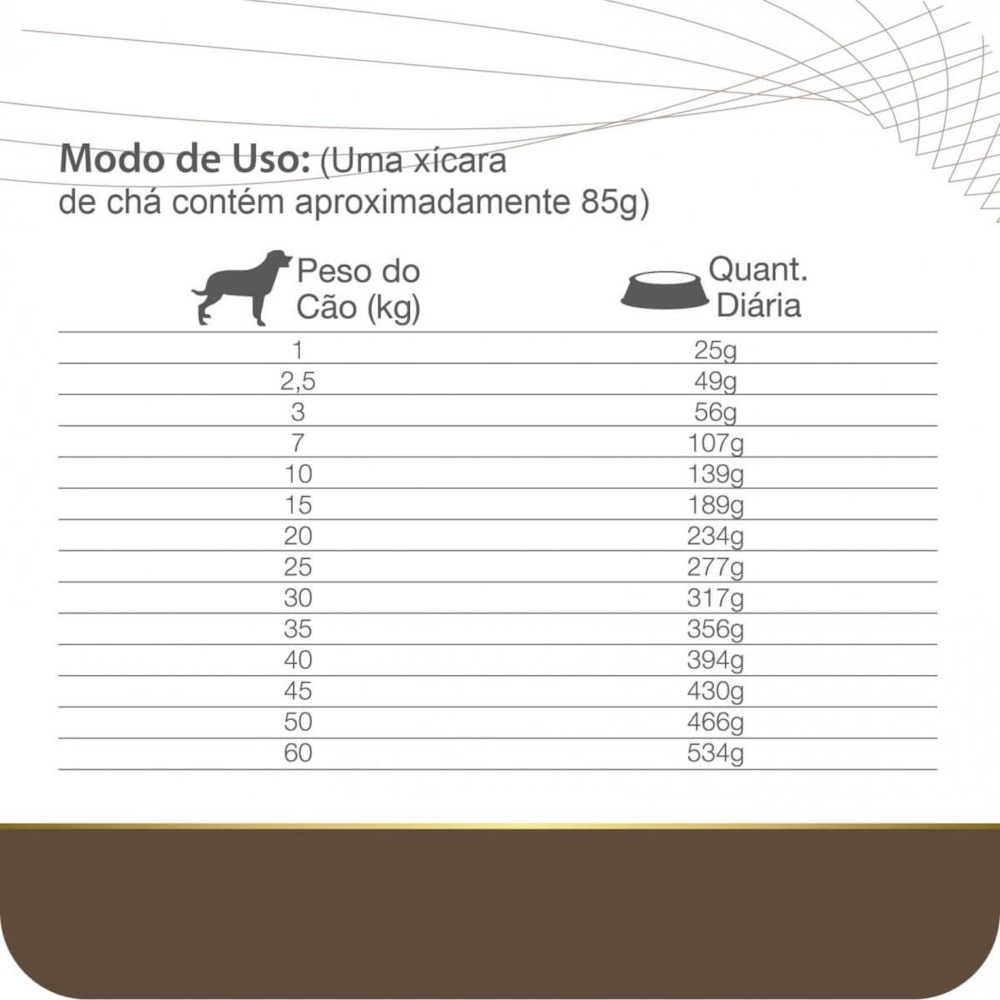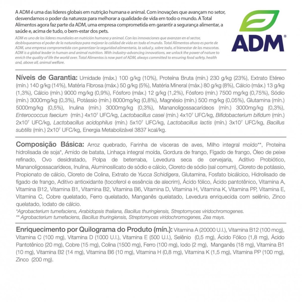 Arroz quebrado, farinha de vísceras de frango, milho integral moído, proteína hidrolisada de soja, semente de linhaça, gordura de frango, fígado de frango, óleo de peixe refinado, ovo desidratado, polpa de beterraba, levedura seca de cervejaria, aditivo probiótico, mannanoligossacarídeos, inulina, aluminiosilicato de sódio e cálcio, cloreto de potássio, cloreto de sódio (sal comum), extrato de yucca schidigera, aditivo antioxidante (tocoferol e essência de alecrim), DL-metionina, taurina, triptofano, glutamina, fosfato bicálcico, ácido fólico, ácido pantotênico, cloreto de colina, betacaroteno, vitamina A, vitamina B12, vitamina B1, vitamina B2, vitamina B6, vitamina D, vitamina H, vitamina K, vitamina PP, vitamina E, vitamina C, cobre quelatado, ferro quelatado, manganês quelatado, levedura enriquecida com selênio, zinco quelatado, iodato de cálcio.