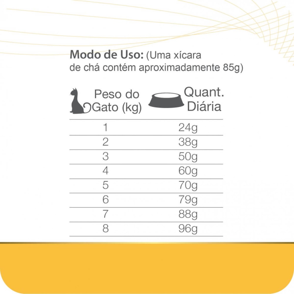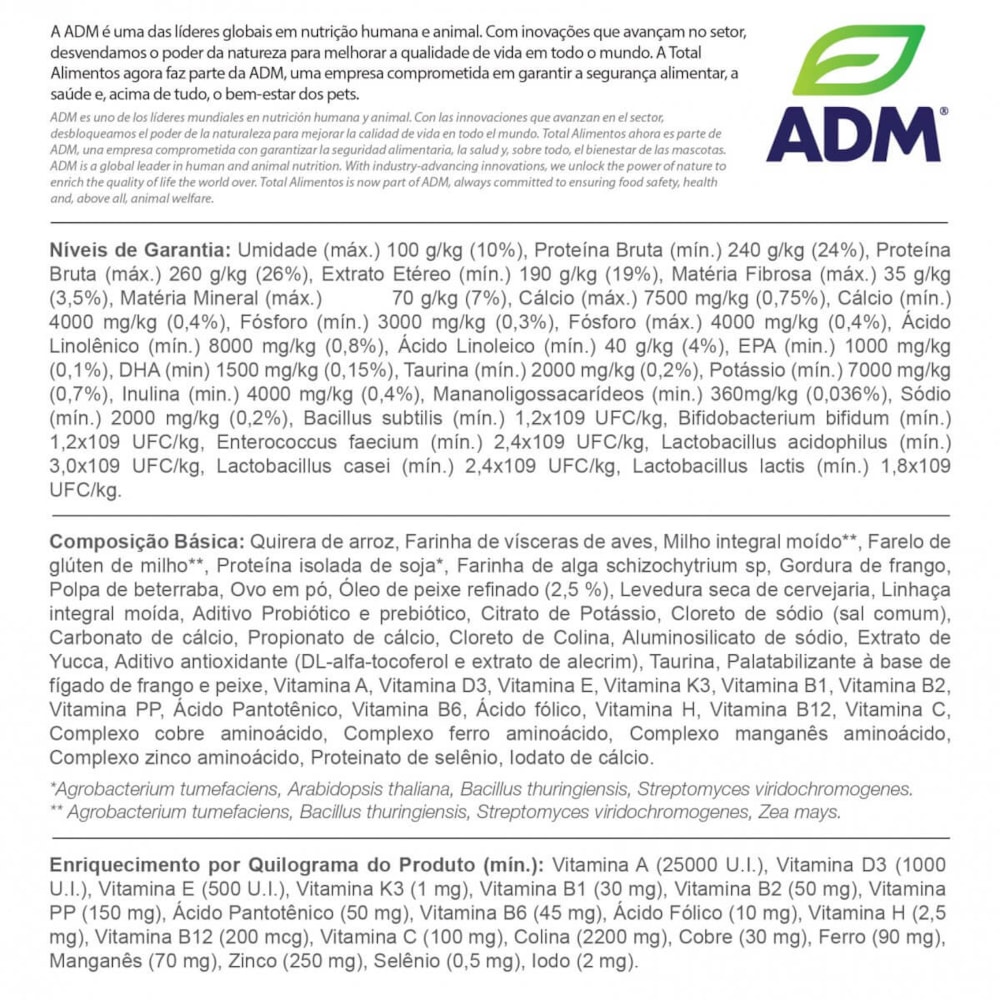 Umidade (máx.) 100 g/kg (10%), Proteína Bruta (mín.) 240 g/kg (24%), Proteína Bruta (máx.) 260 g/kg (26%), Extrato Etéreo (mín.) 190 g/kg (19%), Matéria Fibrosa (máx.) 35 g/kg (3,5%), Matéria Mineral (máx.) 70 g/kg (7%), Cálcio (máx.) 7500 mg/kg (0,75%), Cálcio (mín.) 4000 mg/kg (0,4%), Fósforo (mín.) 3000 mg/kg (0,3%), Fósforo (máx.) 4000 mg/kg (0,4%), Ácido Linolênico (mín.) 8000 mg/kg (0,8%), Ácido Linoleico (mín.) 40 g/kg (4%), EPA (min.) 1000 mg/kg (0,1%), DHA (min) 1500 mg/kg (0,15%), Taurina (mín.) 2000 mg/kg (0,2%), Potássio (mín.) 7000 mg/kg (0,7%), Inulina (min.) 4000 mg/kg (0,4%), Mananoligossacarídeos (min.) 360mg/kg (0,036%), Sódio (mín.) 2000 mg/kg (0,2%), Bacillus subtilis (mín.) 1,2x109 UFC/kg, Bifidobacterium bifidum (mín.) 1,2x109 UFC/kg, Enterococcus faecium (mín.) 2,4x109 UFC/kg, Lactobacillus acidophilus (mín.) 3,0x109 UFC/kg, Lactobacillus casei (mín.) 2,4x109 UFC/kg, Lactobacillus lactis (mín.) 1,8x109 UFC/kg.