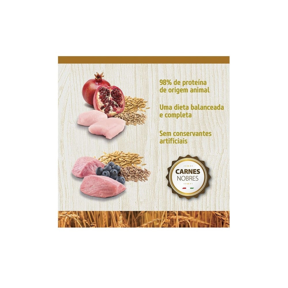 | Composição | Carne de frango (mecanicamente separada), farinha de vísceras de aves (mín. 10%), ovo desidratado, farinha de peixe, farinha de torresmo (proteína isolada de suíno), sorgo, aveia (mín. 0,5%), cevada (mín. 0,5%), óleo de frango, óleo de peixe, polpa de beterraba, casca de ervilha, alfafa desidratada, lignocelulose, semente de psyllium, levedura seca de cervejaria, cenoura desidratada, espinafre desidratado, laranja desidratada, maçã desidratada, blueberry desidratado, extrato de romã (mín. 0,08%), extrato de chá verde, extrato de aloe vera, cúrcuma em pó, beta caroteno, luteína, aditivos prebióticos (FOS e MOS), DL-metionina, taurina, L-carnitina, sulfato de condroitina, sulfato de glicosamina, extrato de yucca, zeolita, hidrolisado de fígado de frango e suíno, vitaminas (A, D3, E, B1, B2, B6, B12, C, biotina, niacina, ácido pantotênico, ácido fólico, cloreto de colina), fosfato bicálcico, ácido fosfórico, carbonato de cálcio, cloreto de potássio, ferro aminoácido quelato, cobre aminoácido quelato, zinco aminoácido quelato, manganês aminoácido quelato, proteinato de selênio, iodato de cálcio, propionato de cálcio, concentrado de tocoferóis. Eventual substitutivo: proteína hidrolisada de peixe. | ||||||||||||||||||||||||||||||||||||||||||||||