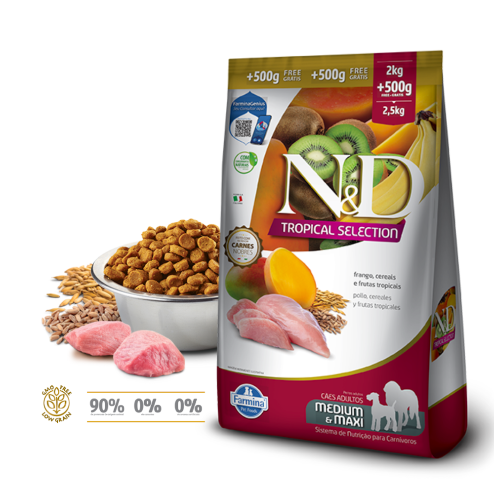 Ração Farmina N&D Tropical Selection Cães Adultos Porte Médio e Grande Sabor Frango, Cereais e Frutas Tropicais