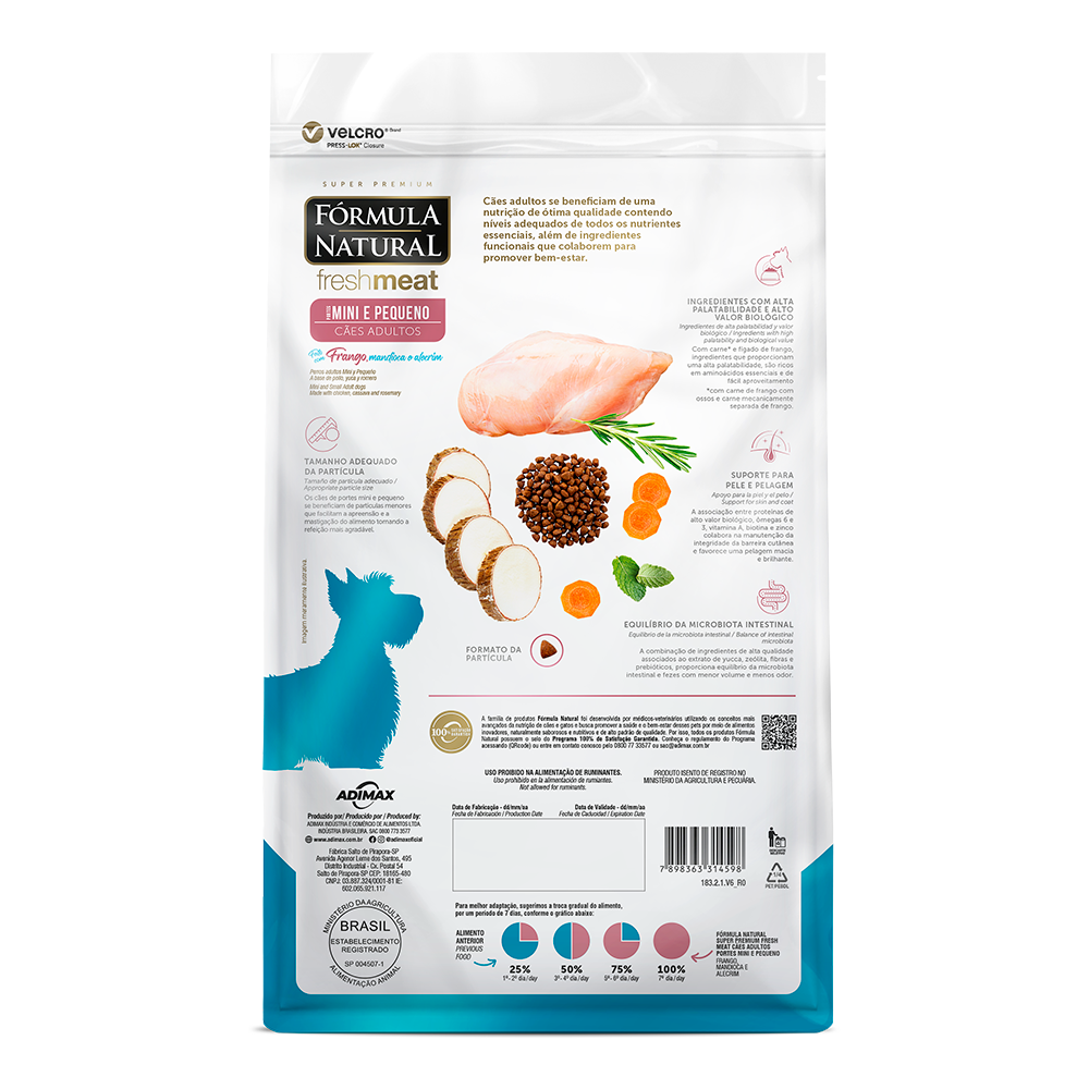 A Ração Fórmula Natural Fresh Meat Cães Adultos Porte Mini e Pequeno, sabor frango, mandioca e alecrim, é a nutrição certa em níveis adequados, com os nutrientes que promover mais saúde e bem-estar aos cães. Confira mais detalhes do fabricante: