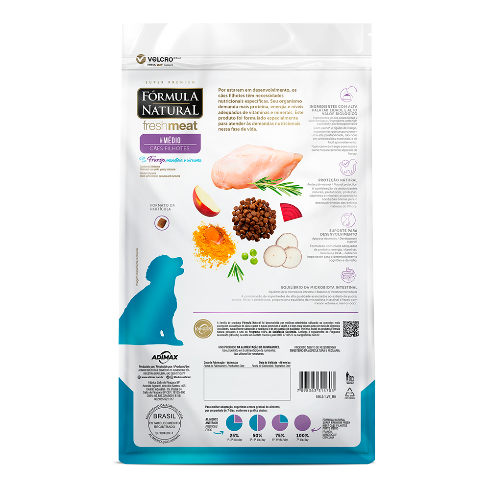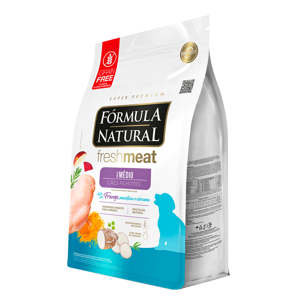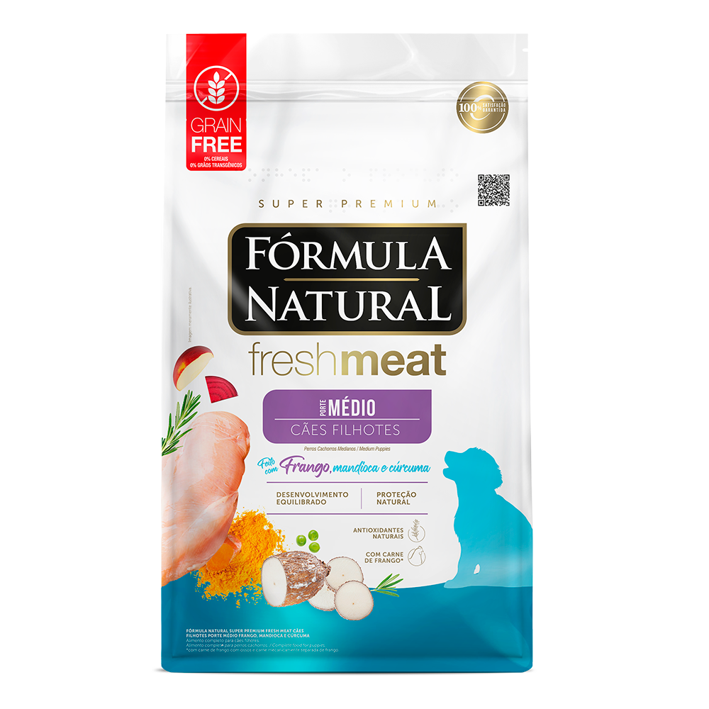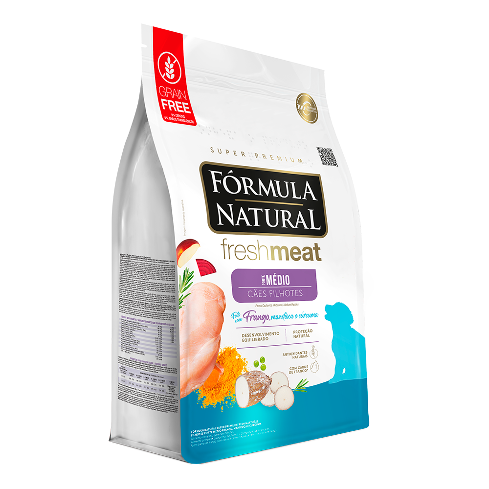 A Ração Fórmula Natural Fresh Meat Cães Filhotes Porte Médio foi desenvolvida visando a fase do pet que nesta idade seu organismo demanda mais proteína, energia e outras vitaminas e minerais. Confira mais detalhes do fabricante: