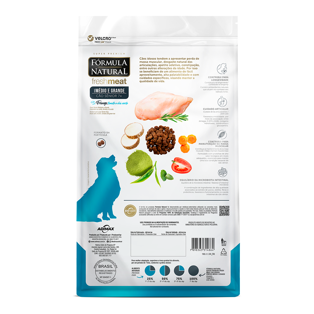 A Ração Fórmula Natural Fresh Meat Cães Sênior Portes Médio e Grande é indicada para cães acima de 7 anos, fase em que apresentam perda de massa muscular, desgaste nas articulações, paladrar mais seletivo, constipação e outras limitações. Um alimento seguro e de fácil aproveitamente, promovendo qualidade de vida. Confira mais detalhes do fabricante a seguir: