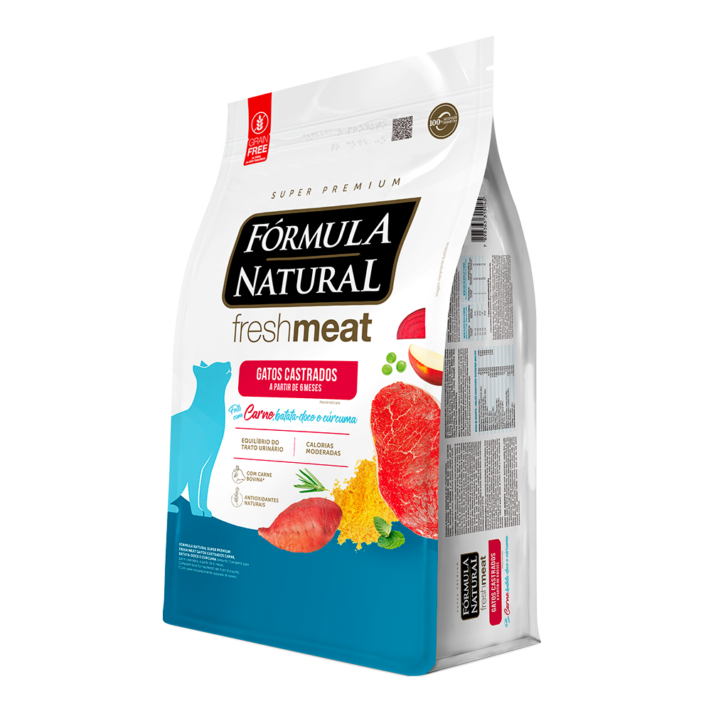 A Ração Fórmula Natural Fresh Meat Gatos Adultos Castrados Sabor Carne foi desenvolvida para atender gatos que após castração tendem a viver uma vida mais sedentária e a tendência ao ganho de peso excessivo. Confira a seguir os detalhes do fabricante: