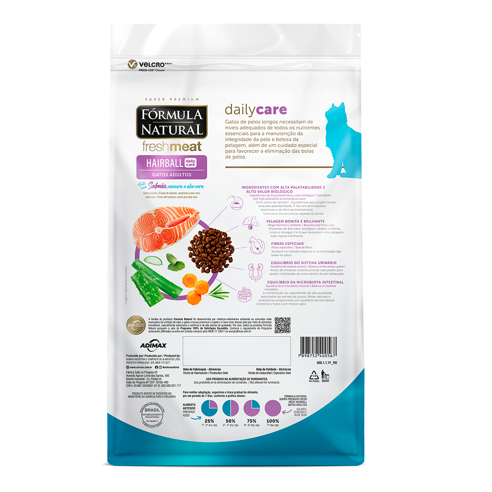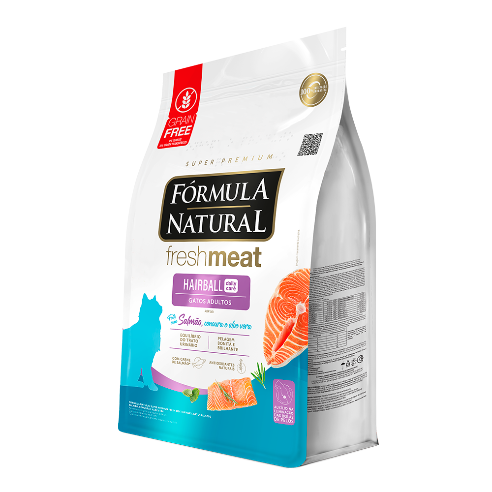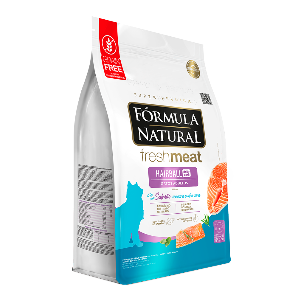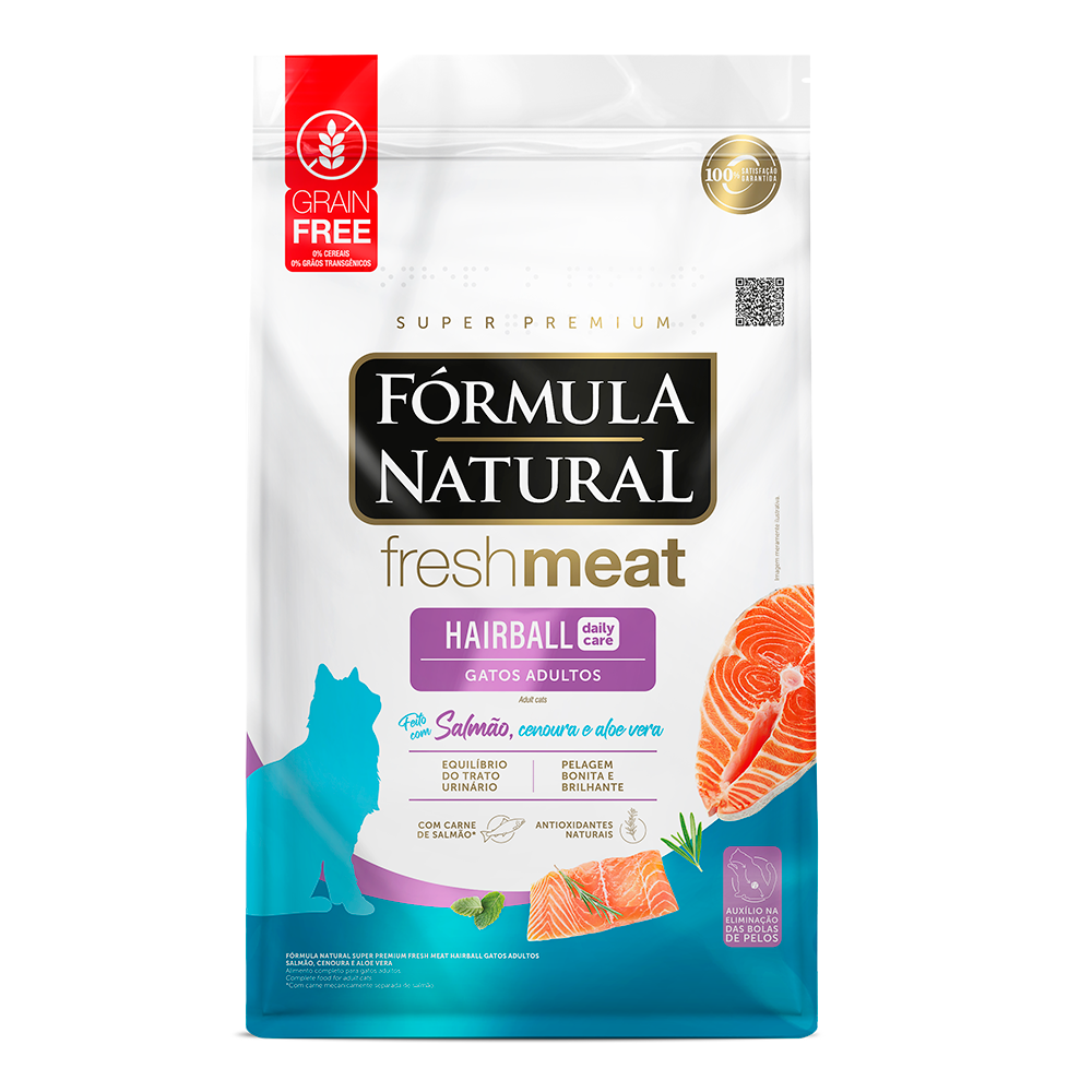 A Ração Fórmula Natural Fresh Meat Gatos Hairball Sabor Salmão foi desenvolvida por profissionais que utilizaram os conceitos mais modernos de nutrição pet. Saborosa e bastante nutritiva, este produto ainda auxilia na eliminação de bolas de pelo e também no trato urinário de felinos, graças ao seu diferencial que é a utilização de carne fresca e fontes especiais de carboidratos, fibras, vitaminas e minerais, como as frutas e vegetais. Confira mais detalhes do fabricante: