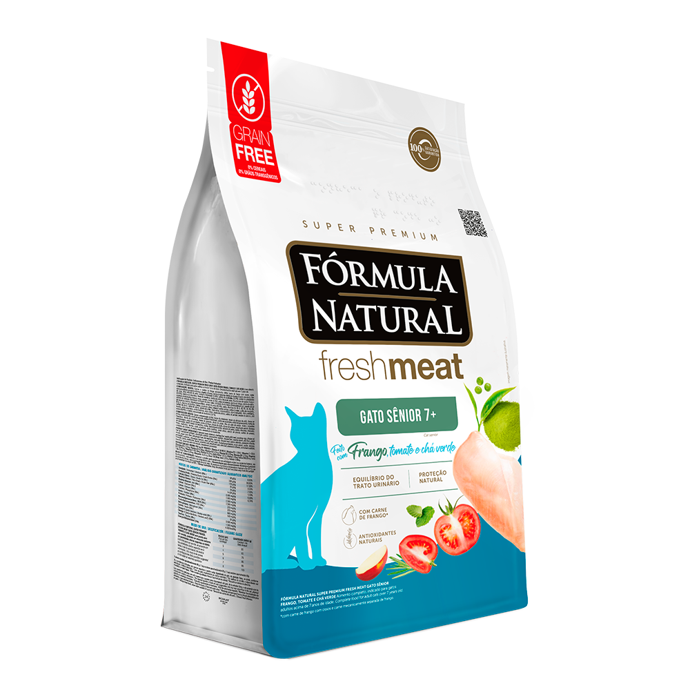 A Ração Fórmula Natural Fresh Meat Gatos Sênior é um alimento de alta qualidade e palatabilidade, desenvolvido com base nas demandas de gatos geriátricos, que geralmente apresentam diminuição do aproveitamento do alimento, perda de massa muscular e de peso. Confira mais detalhes do fabricante: