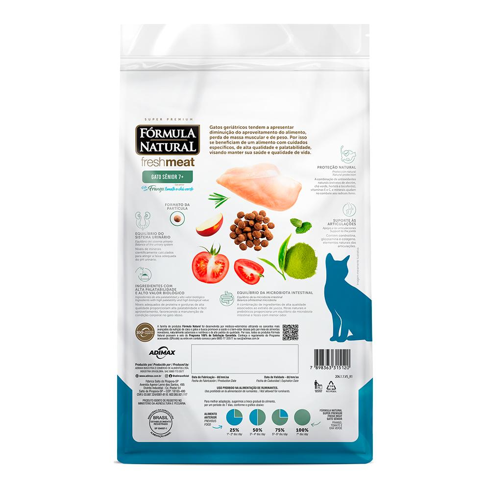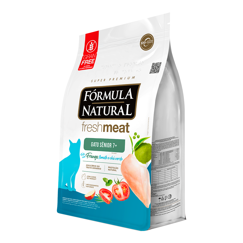 A Ração Fórmula Natural Fresh Meat Gatos Sênior é um alimento de alta qualidade e palatabilidade, desenvolvido com base nas demandas de gatos geriátricos, que geralmente apresentam diminuição do aproveitamento do alimento, perda de massa muscular e de peso. Confira mais detalhes do fabricante: