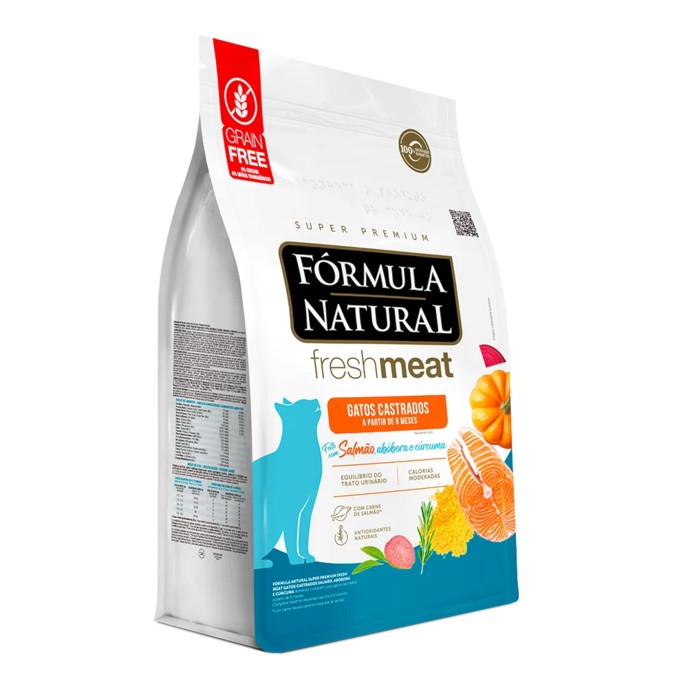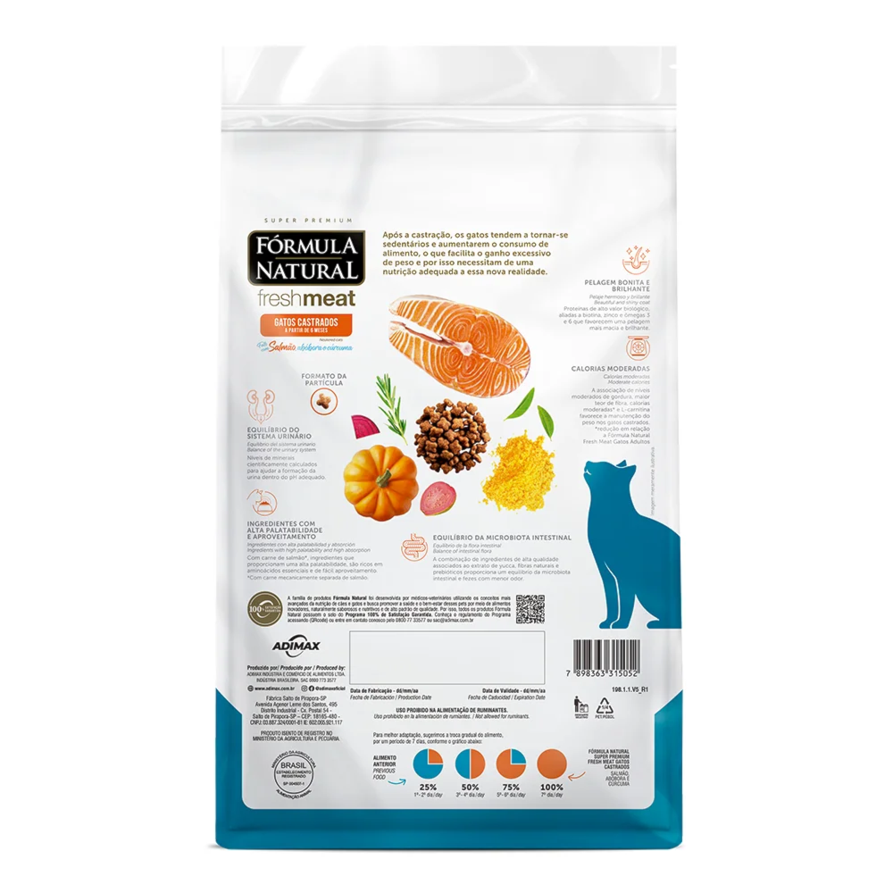 Detalhes do produto A Ração Fórmula Natural Fresh Meat Gatos Adultos Castrados Sabor Salmão foi desenvolvida para atender gatos que após castração tendem a viver uma vida mais sedentária e com ganho de peso excessivo. Confira a seguir os detalhes do fabricante: