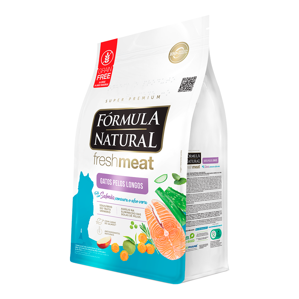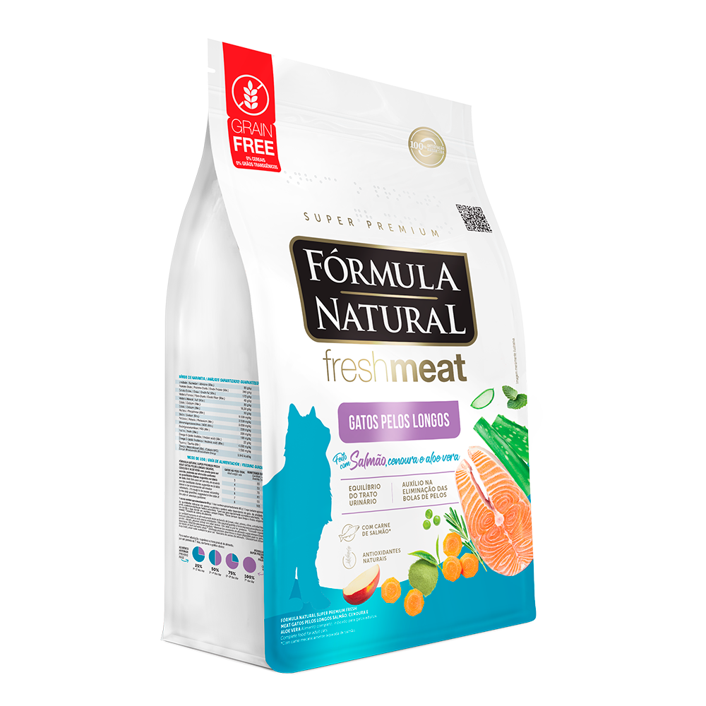 Detalhes do produto: A Ração Fórmula Natural Fresh Meat Salmão Gatos Pelos Longos foi desenvolvida por profissionais que utilizaram os conceitos mais modernos de nutrição pet. Saborosa e bastante nutritiva, este produto ainda auxilia na eliminação de bolas de pelo e também no trato urinário de felinos, graças ao seu diferencial que é a utilização de carne fresca e fontes especiais de carboidratos, fibras, vitaminas e minerais, como as frutas e vegetais. Confira mais detalhes do fabricante: