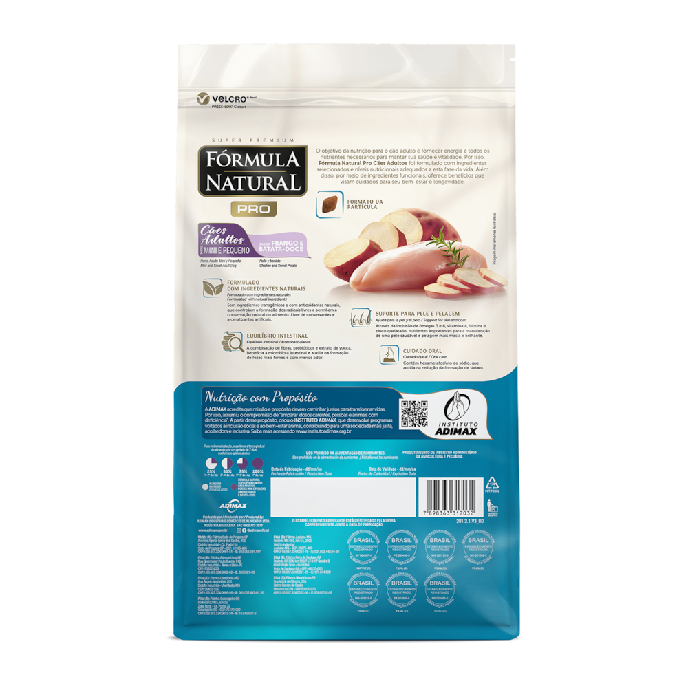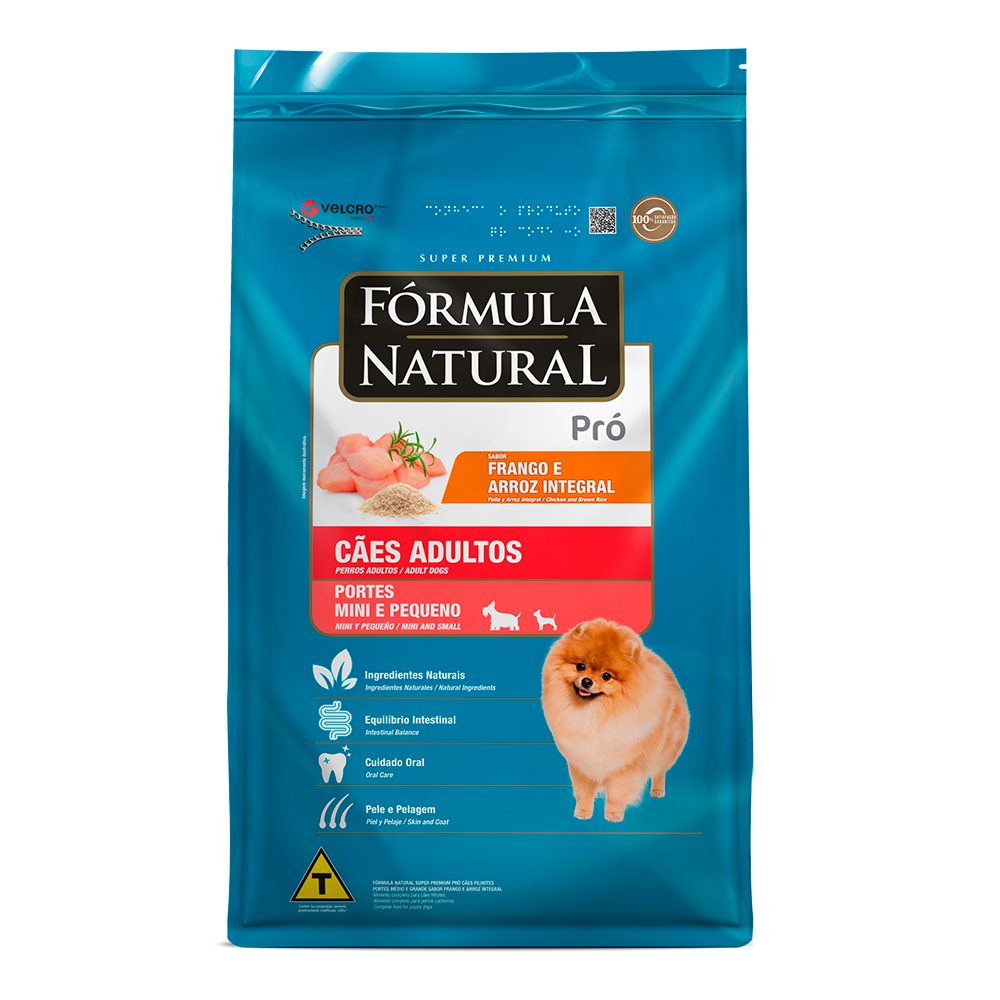 Descrição do produto: A Ração Fórmula Natural Super Premium Pró Cães Adultos Portes Mini e Pequeno Sabor Frango e Arroz Integral auxilia na saúde intestinal, contribui para uma pelagem bonita e saudável, além de promover cuidado com a saúde oral e das articulações. Formulada com ingredientes naturais, não contém corantes e aromatizantes artificiais, oferece também todos os cuidados para promover saúde, longevidade e qualidade de vida aos cães adultos. Veja mais detalhes do fabricante: