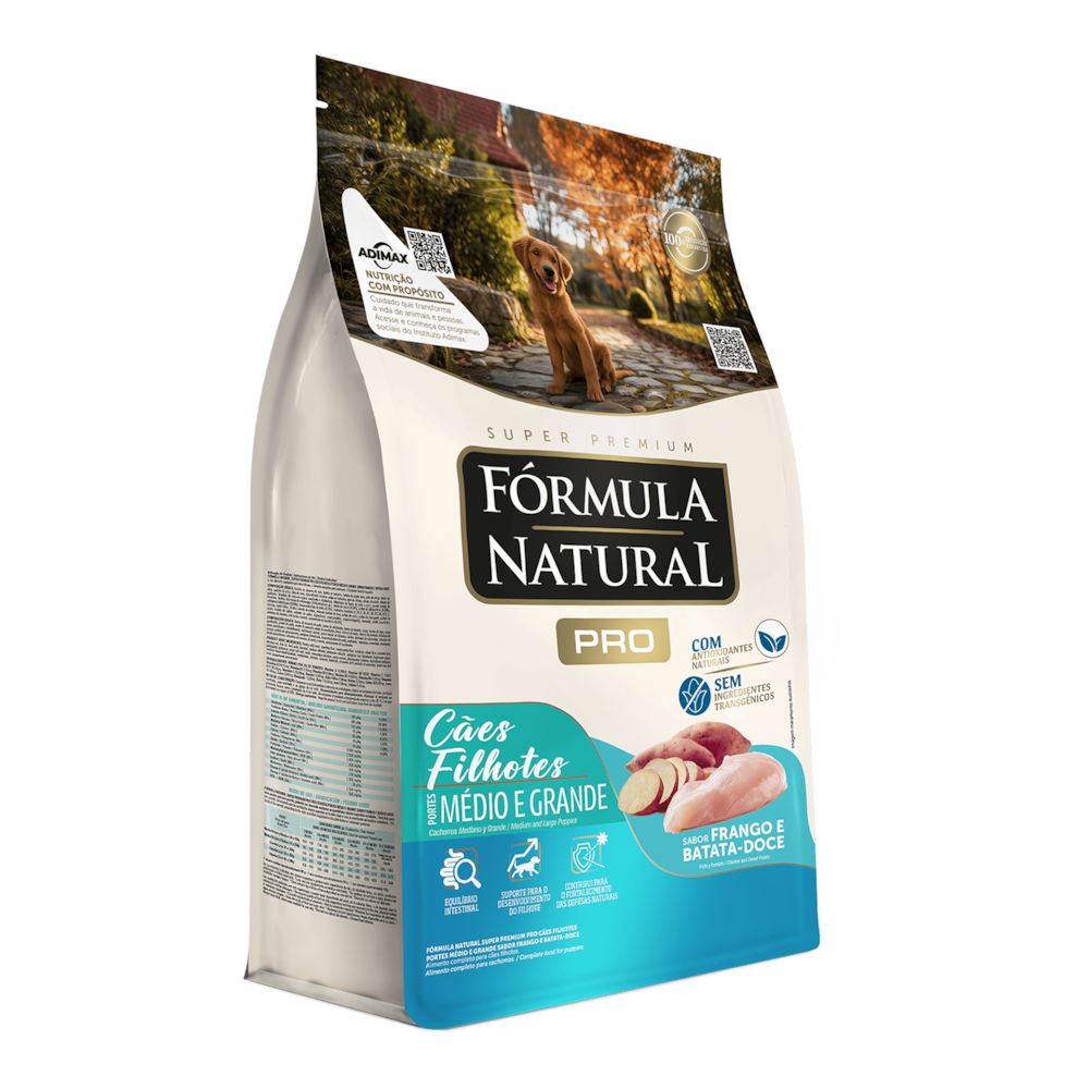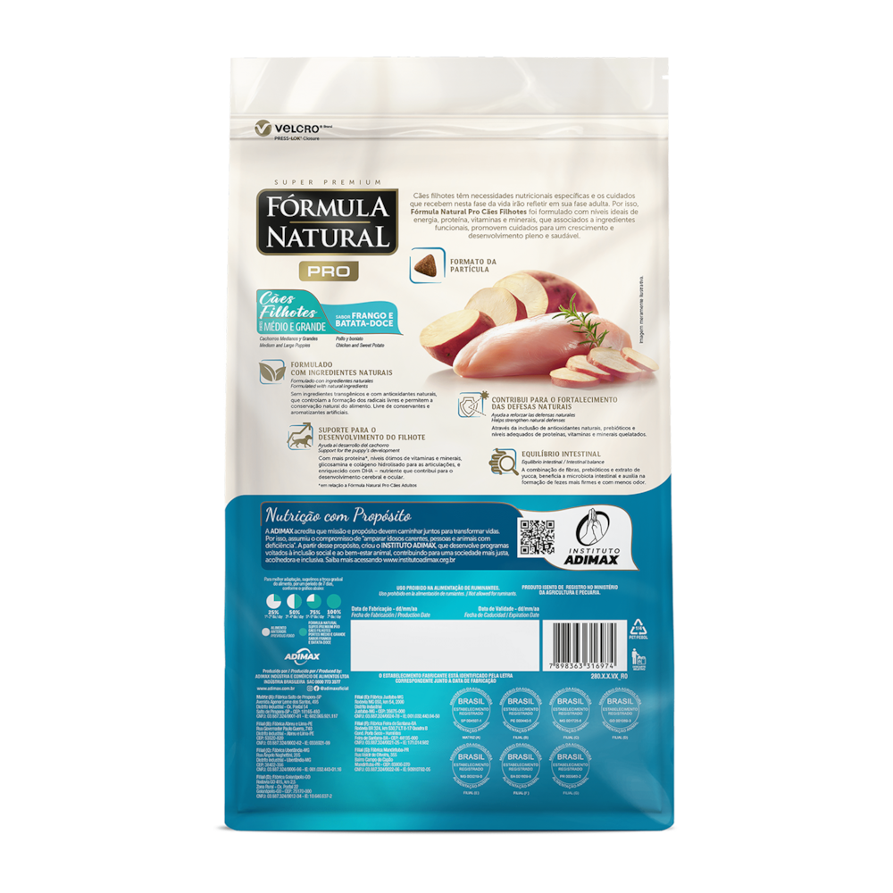 A Ração Fórmula Natural Pró Super Premium Cães Filhotes Portes Médio e Grande Sabor Frango e Arroz Integral oferece uma nutrição de alta qualidade que auxilia na saúde intestinal, contribui para uma pelagem bonita e saudável, e ainda promove cuidado com a saúde oral e das articulações. Além disso, foi formulada com ingredientes naturais, não contém corantes e aromatizantes artificiais. Confira mais detalhes do fabricante: