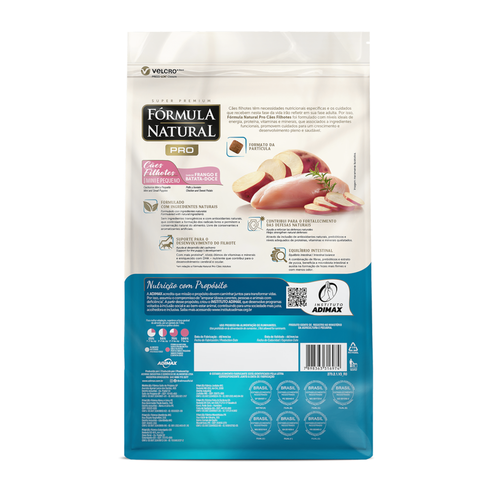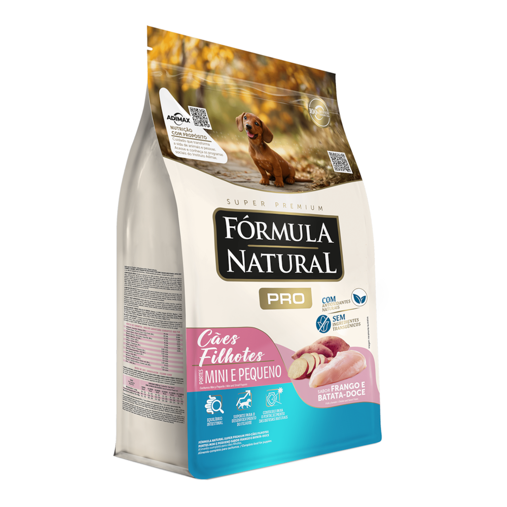 A Ração Fórmula Natural Pró Super Premium Cães Filhotes Raças Mini e Pequenas Frango e Arroz Integral oferece uma nutrição de alta qualidade que auxilia na saúde intestinal, contribui para uma pelagem bonita e saudável, e ainda promove cuidado com a saúde oral e das articulações. Além disso, foi formulada com ingredientes naturais, não contém corantes e aromatizantes artificiais. Confira mais detalhes do fabricante: