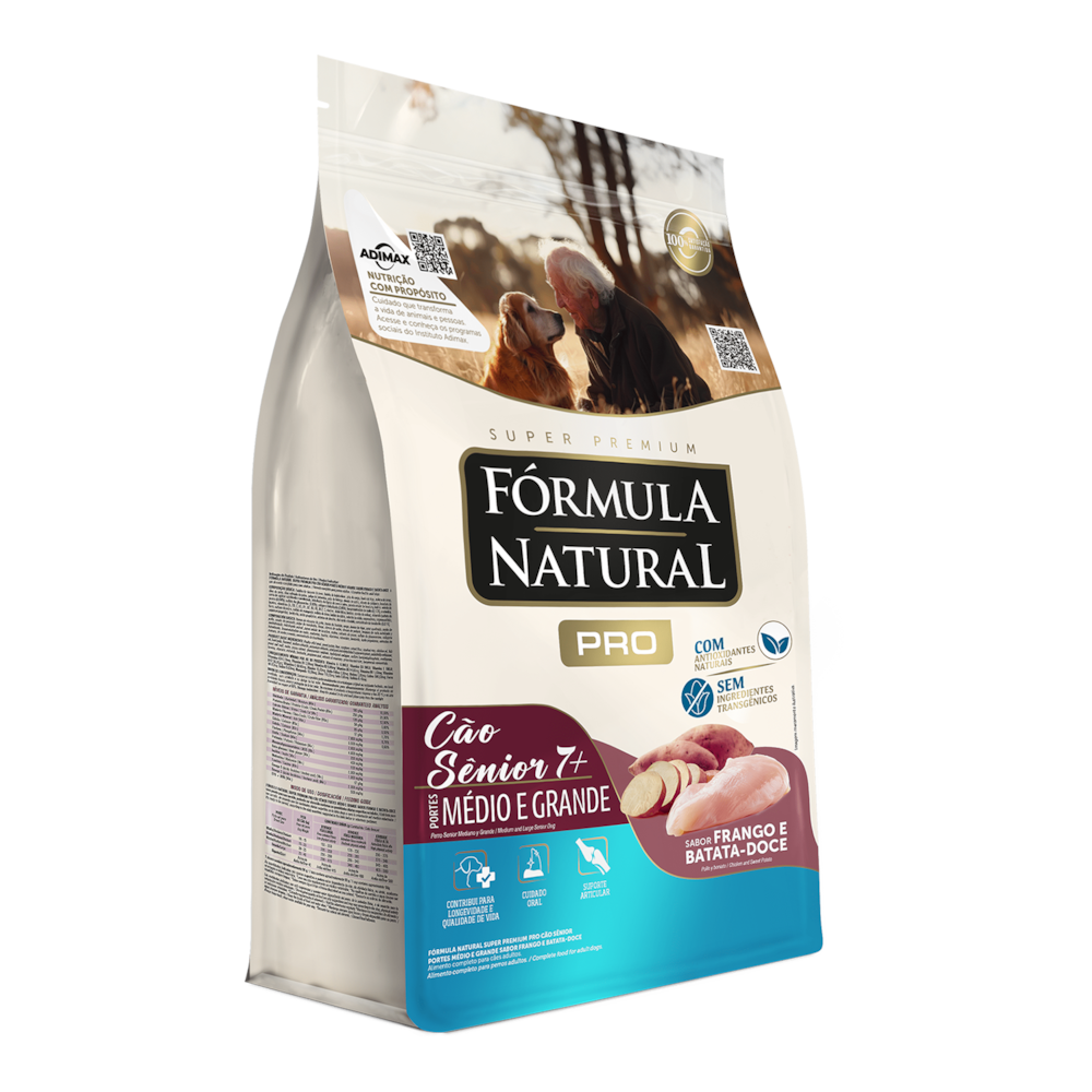 Descrição do produto: A Ração Fórmula Natural Pró Super Premium Cães Sênior Portes Médio e Grande Sabor Frango e Arroz Integral oferece uma nutrição de alta qualidade para cães, auxiliando na saúde intestinal, tornando a pelagem bonita e saudável, e promovendo cuidado com a saúde oral e das articulações. Formulada com ingredientes naturais, não contém corantes e aromatizantes artificiais. Confira mais detalhes do fabricante: