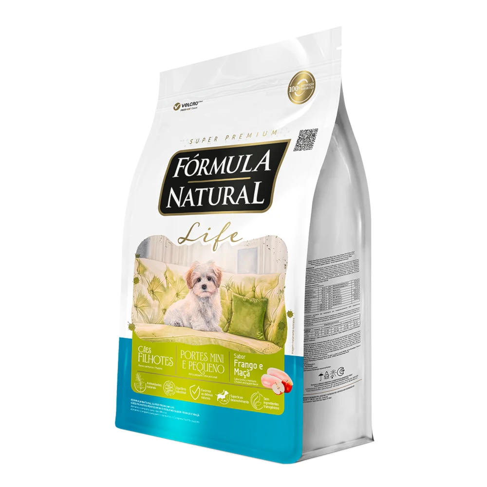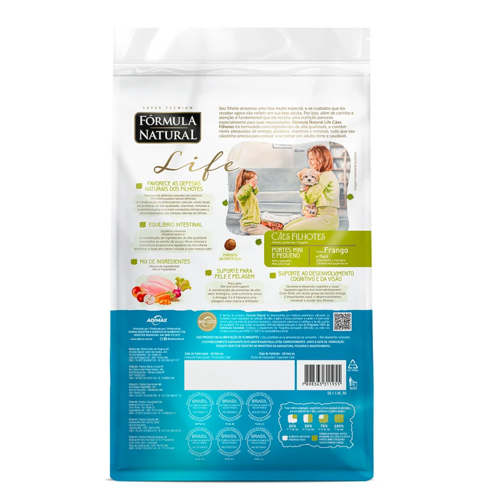 Detalhes do produto A Ração Fórmula Natural Super Premium Life Cães Filhotes Portes Mini e Pequeno, sabor Frango e Maçã, foi desenvolvida com ingredientes de alta qualidade, e níveis adequados de energia, proteína, vitaminas e minerais, que serão essenciais para seu filhote se tornar um adulto forte e saudável. Além do carinho, oferecer uma nutrição eficiente é também grande demonstração de cuidado e amor. Saiba mais com os detalhes do fabricante: