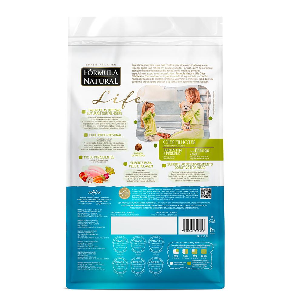 A Ração Fórmula Natural Super Premium Life Cães Filhotes Portes Mini e Pequeno, sabor Frango e Maçã, foi desenvolvida com ingredientes de alta qualidade, e níveis adequados de energia, proteína, vitaminas e minerais, que serão essenciais para seu filhote se tornar um adulto forte e saudável. Além do carinho, oferecer uma nutrição eficiente é também grande demonstração de cuidado e amor. Saiba mais com os detalhes do fabricante: