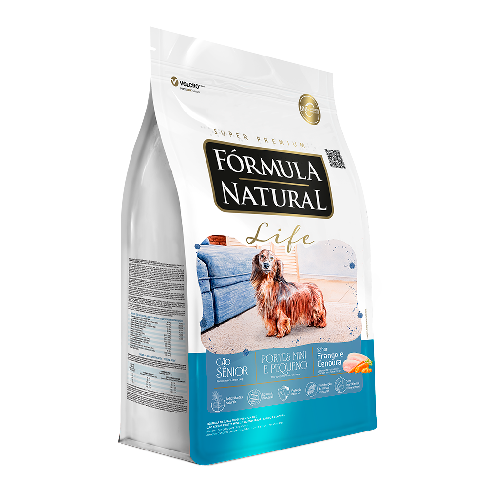Descrição do produto: A Ração Fórmula Natural Super Premium Life Cão Sênior Portes Mini e Pequeno, sabor Frango e Cenoura é um alimento que favorece a saúde e longeividade de cães acima de 7 anos de idade. Este produto foi cuidadosamente elaborado com níveis nutricionais adequados, utilizando ingredientes selecionados, que garantem uma ótima nutrição. Confira mais detalhes do fabricante: