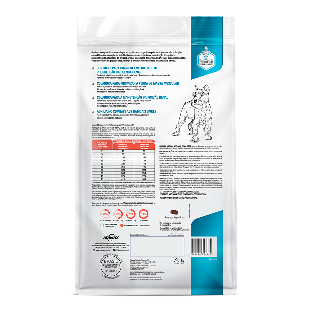 Descrição do produto: A Ração Fórmula Natural Vet Care Renal para Cães é um alimento coadjuvante desenvolvido para auxiliar no tratamento de cães diagnosticados com doença renal crônica. Confira mais detalhes do fabricante: