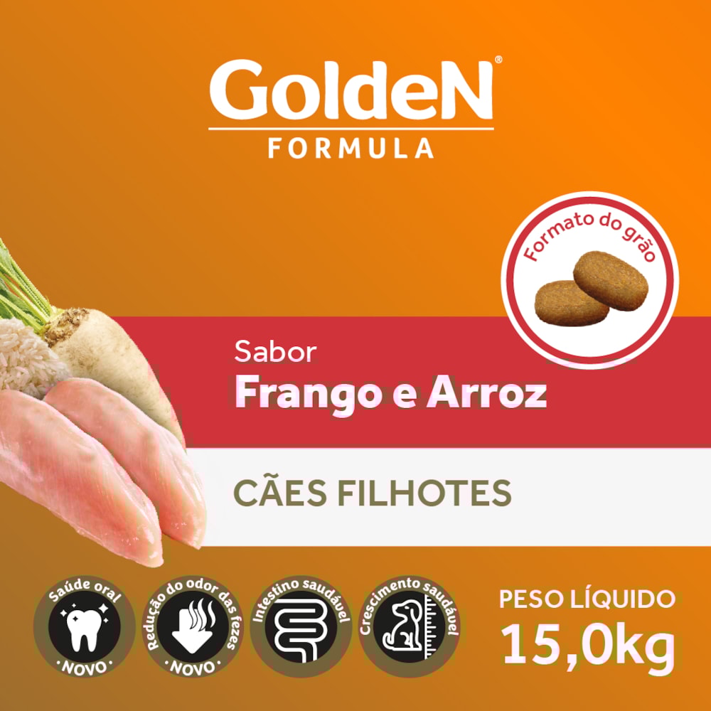 A Ração Golden Fórmula Filhotes Frango & Arroz é um alimento Premium Especial completo que visa, acima de tudo, proporcionar aos cães o nível ideal de todos os nutrientes que eles necessitam para um crescimento forte e saudável.