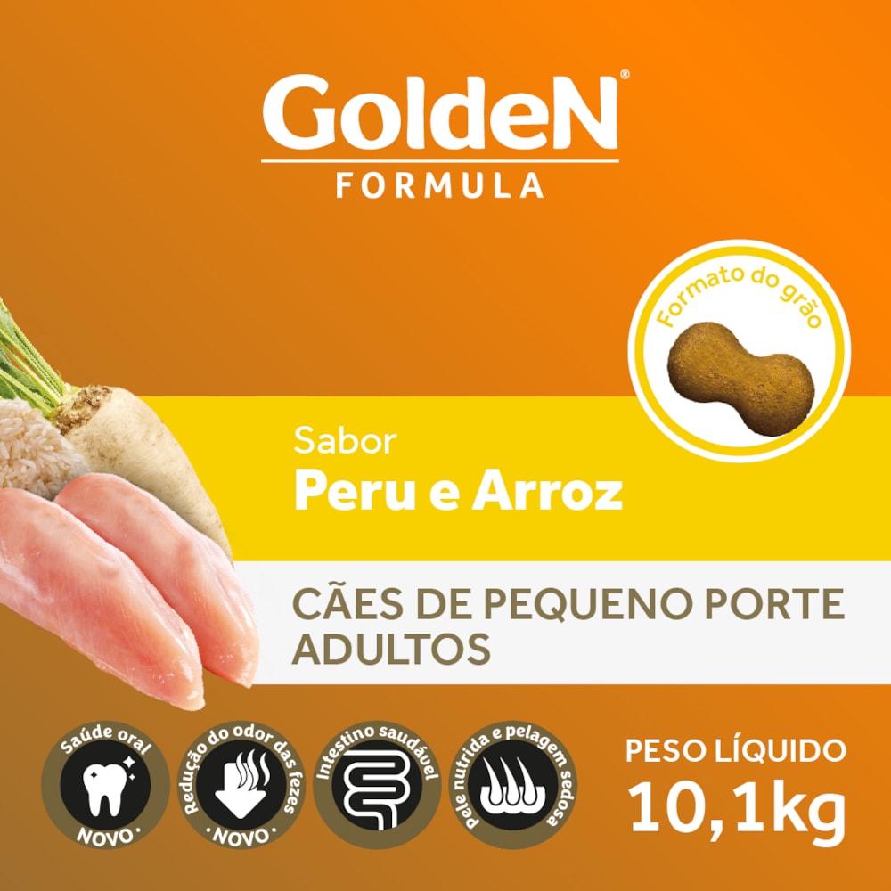 A Ração Golden Formula Cães Adultos Peru & Arroz Mini Bits é um alimento Premium Especial desenvolvido para cães adultos de pequeno porte que promove uma pelagem bonita e saudável, por sua formulação com proteínas de excelente qualidade, auxilia na saúde intestinal e ainda é formulado com Peru e arroz que oferece um sabor incomparável, tudo isso para garantir uma refeição saborosa e uma vida longa e saudável.