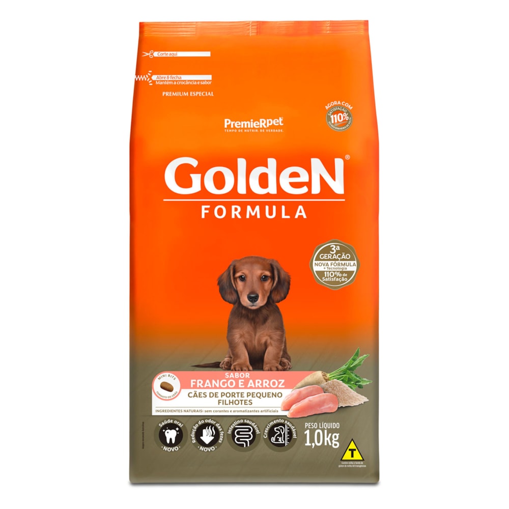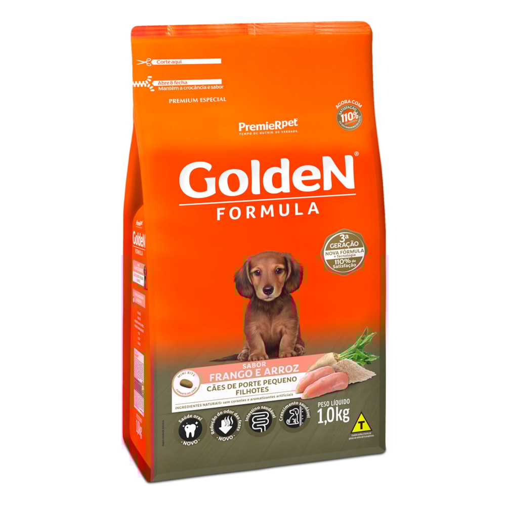 A Ração Golden Fórmula Filhotes Frango & Arroz Pequeno Porte é formulado a partir dos mais modernos conceitos em nutrição. Apresenta grãos adequados para animais de pequeno porte, facilitando a apreensão e mastigação. É um alimento Premium Especial completo que proporciona aos cães filhotes o nível ideal de todos os nutrientes que eles necessitam para um crescimento forte e saudável. Por isso, não é recomendado qualquer tipo de suplementação.