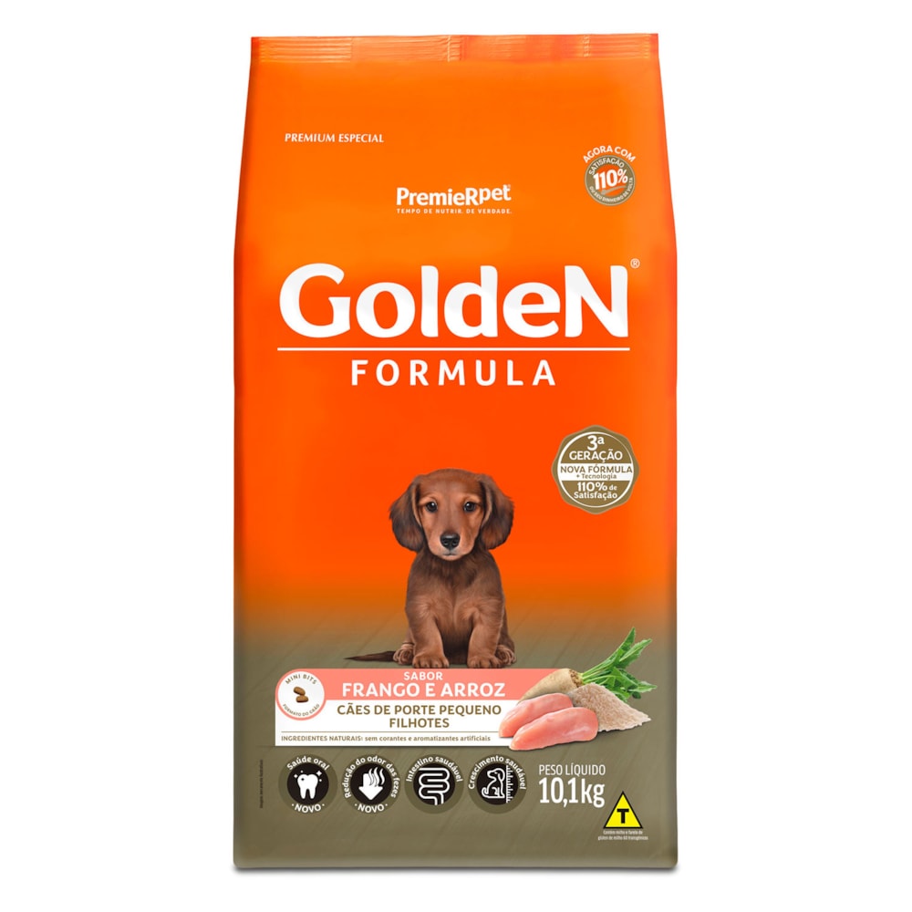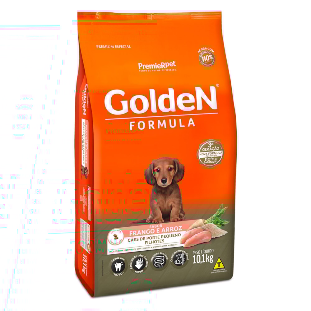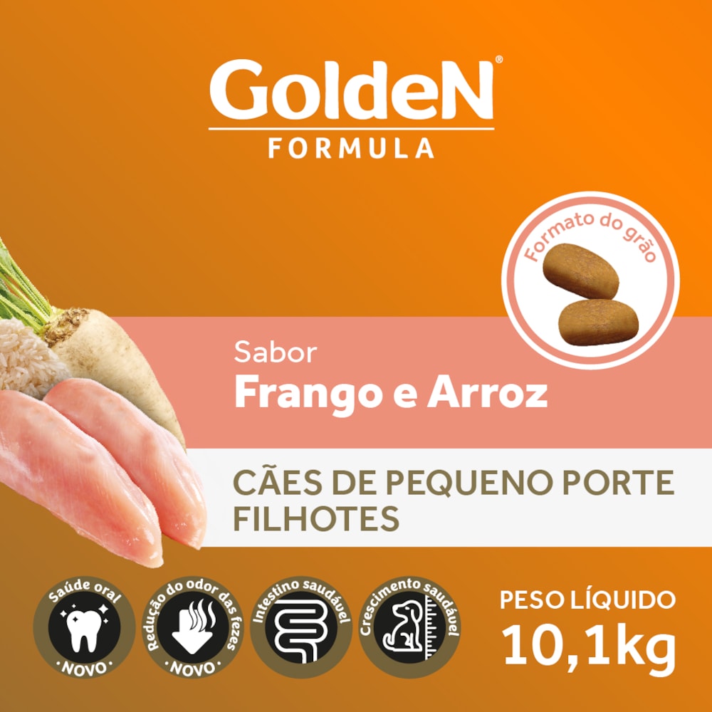 A Ração Golden Fórmula Filhotes Frango & Arroz Pequeno Porte é formulado a partir dos mais modernos conceitos em nutrição. Apresenta grãos adequados para animais de pequeno porte, facilitando a apreensão e mastigação. É um alimento Premium Especial completo que proporciona aos cães filhotes o nível ideal de todos os nutrientes que eles necessitam para um crescimento forte e saudável. Por isso, não é recomendado qualquer tipo de suplementação.