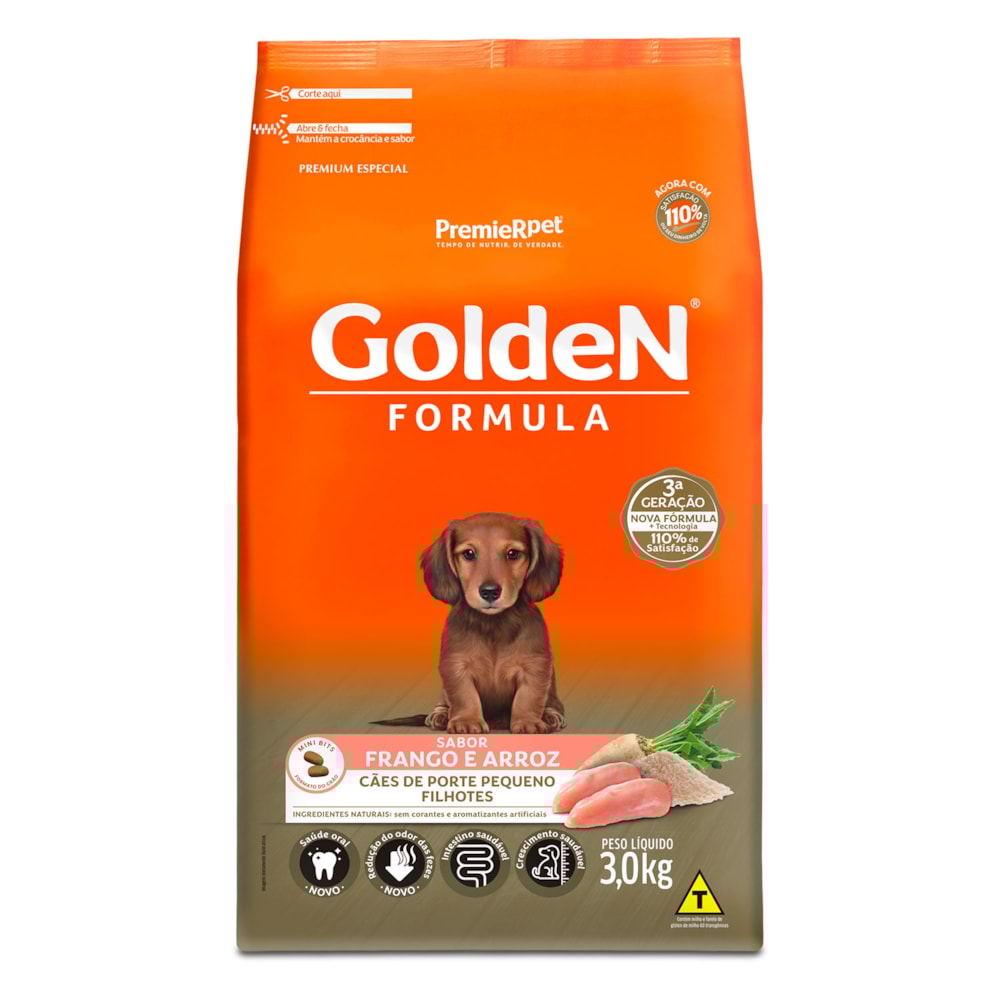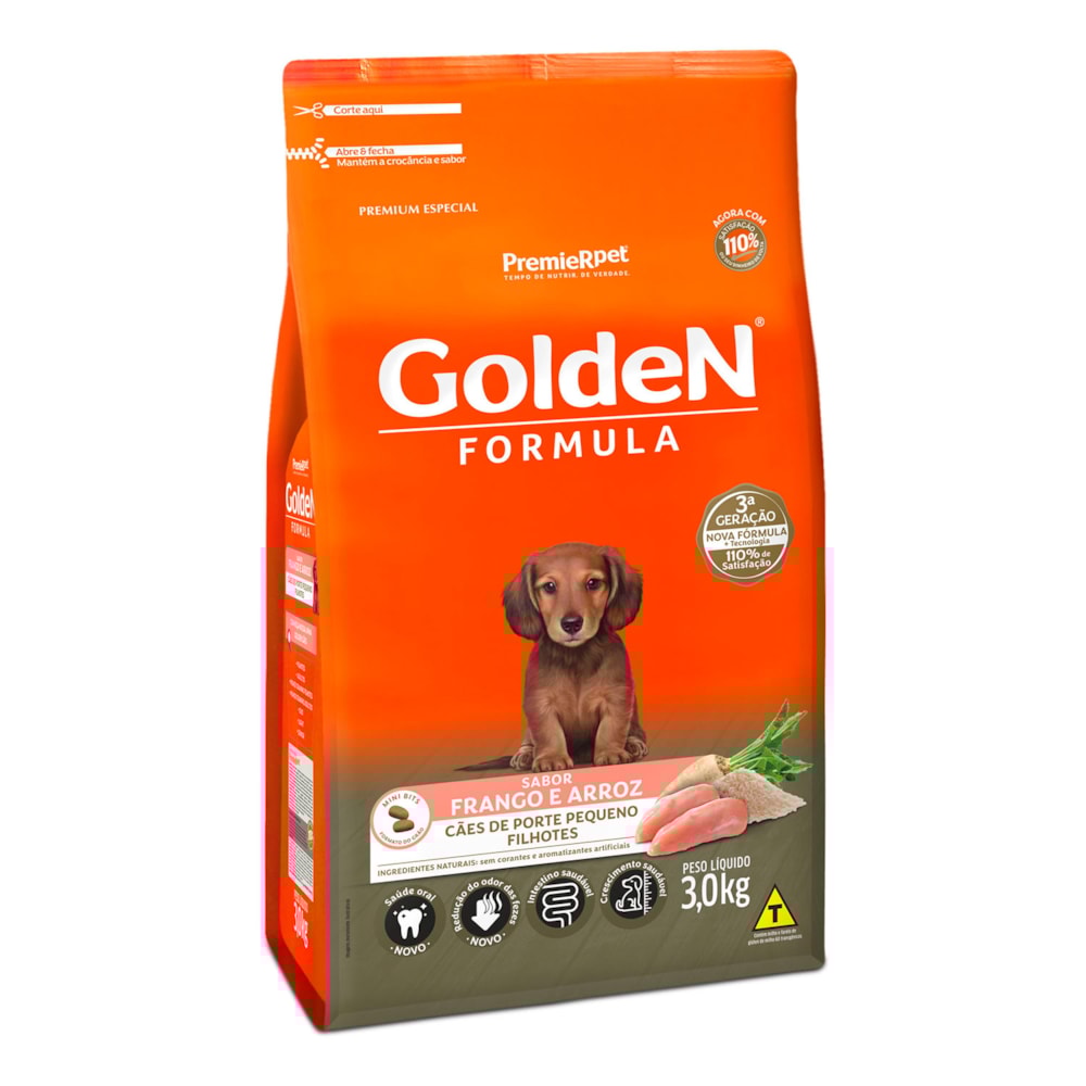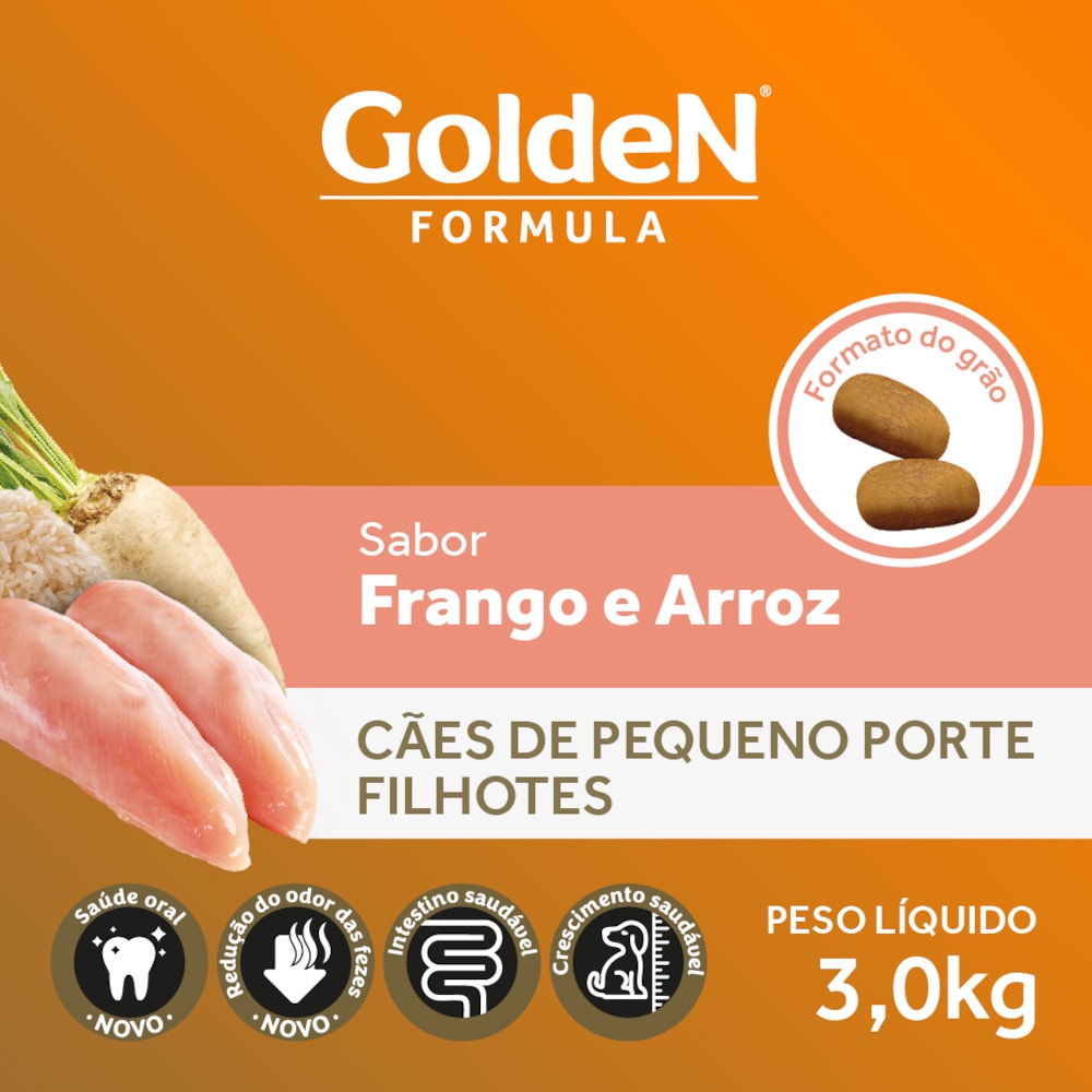 A Ração Golden Fórmula Filhotes Frango & Arroz Pequeno Porte é formulado a partir dos mais modernos conceitos em nutrição. Apresenta grãos adequados para animais de pequeno porte, facilitando a apreensão e mastigação. É um alimento Premium Especial completo que proporciona aos cães filhotes o nível ideal de todos os nutrientes que eles necessitam para um crescimento forte e saudável. Por isso, não é recomendado qualquer tipo de suplementação.