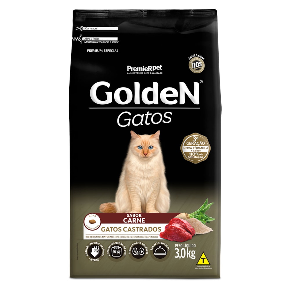 A Ração Golden para Gatos Adultos Castrados sabor Carne é um alimento completo especialmente formulado para atender ás necessidades dos gatos castrados, desenvolvido com todas as vitaminas, nutrientes e substâncias que o seu gato precisa para viver de forma mais saudável. Com 36% de proteína, é indicado para gatos castrados a partir dos 6 meses de idade. Sua fórmula contém Ômegas 3 e 6 e Zinco que ajudam a manter a pele protegida e reduz a queda de pelos, ainda possui a Taurina em sua composição para uma longevidade ativa. As proteínas da Ração Golden para gatos Adultos Castrados sabor Carne auxilia na prevenção da obesidade e no cuidado com o trato urinário, além de conter a L-Carnitina especiais para o controle do peso ideal. Sua composição também é enriquecida de Vitamina A, C, E, B12, K3 e D3 que facilitam a absorção e equilibram a demanda nutricional do seu gato, proporcionando mais vigor para as atividades do dia a dia.