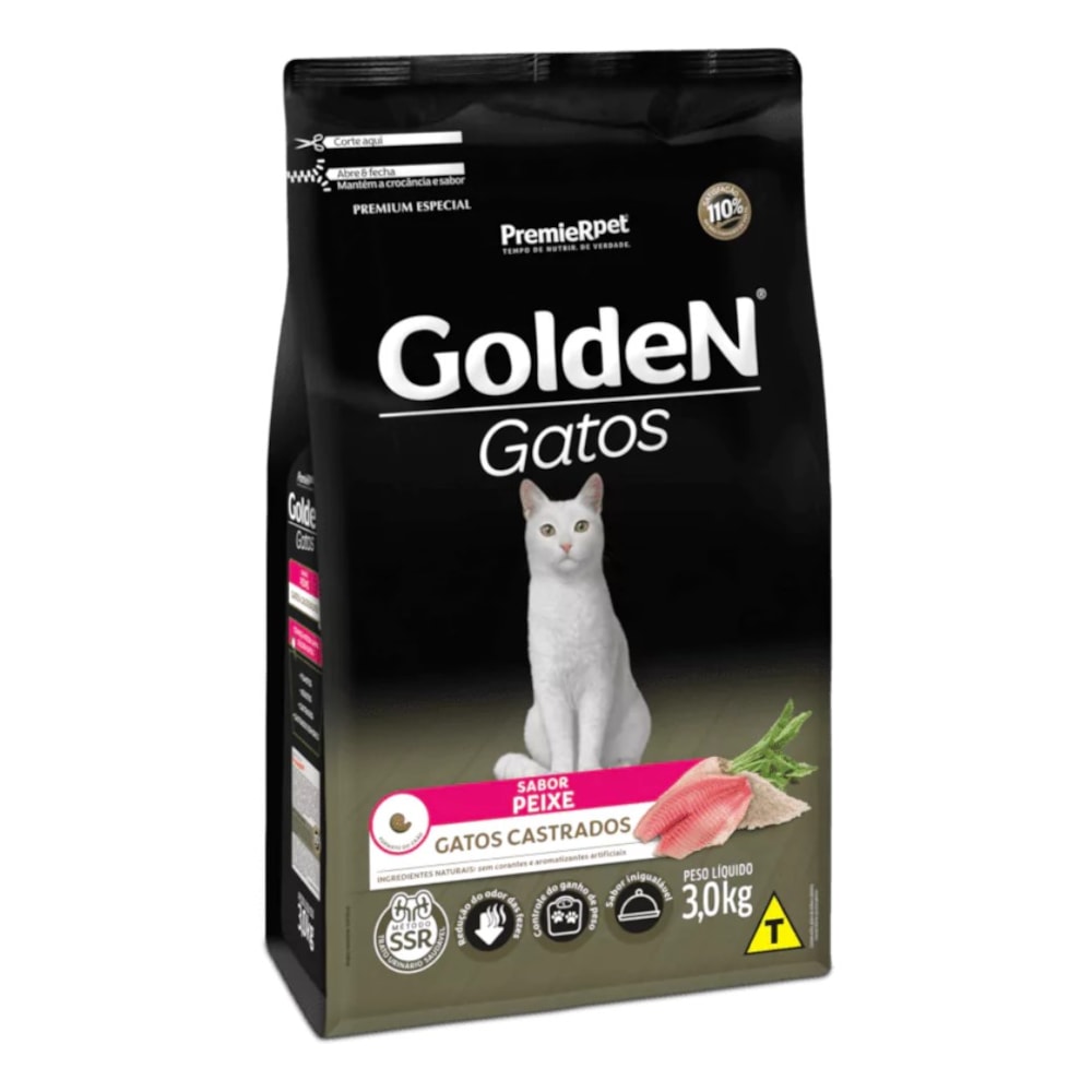 GoldeN Gatos Castrados Sabor Peixe é um alimento completo, balanceado e rico em nutrientes, indicado para gatos castrados a partir dos 6 meses de idade e contraindicado para filhotes de idade inferior a 6 meses, fêmeas gestantes e lactantes, devido ao seu reduzido teor calórico.