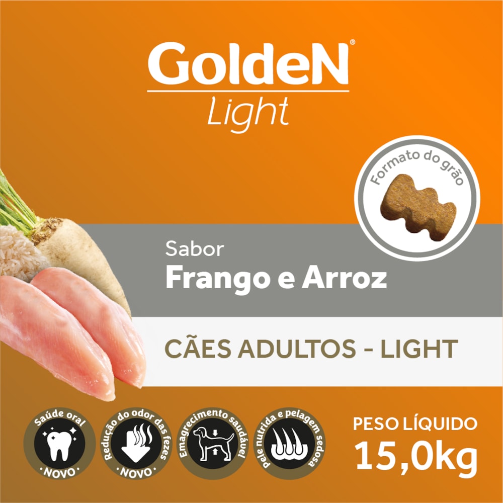 d) Está mais sedentário devido ao avançar da idade Golden Formula Light Cães Adultos é um alimento cientificamente balanceado para promover a perda e manutenção de peso saudáveis no seu cão.