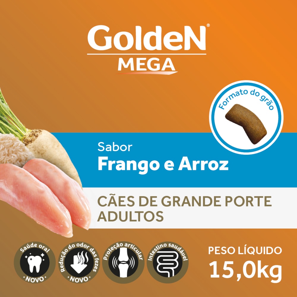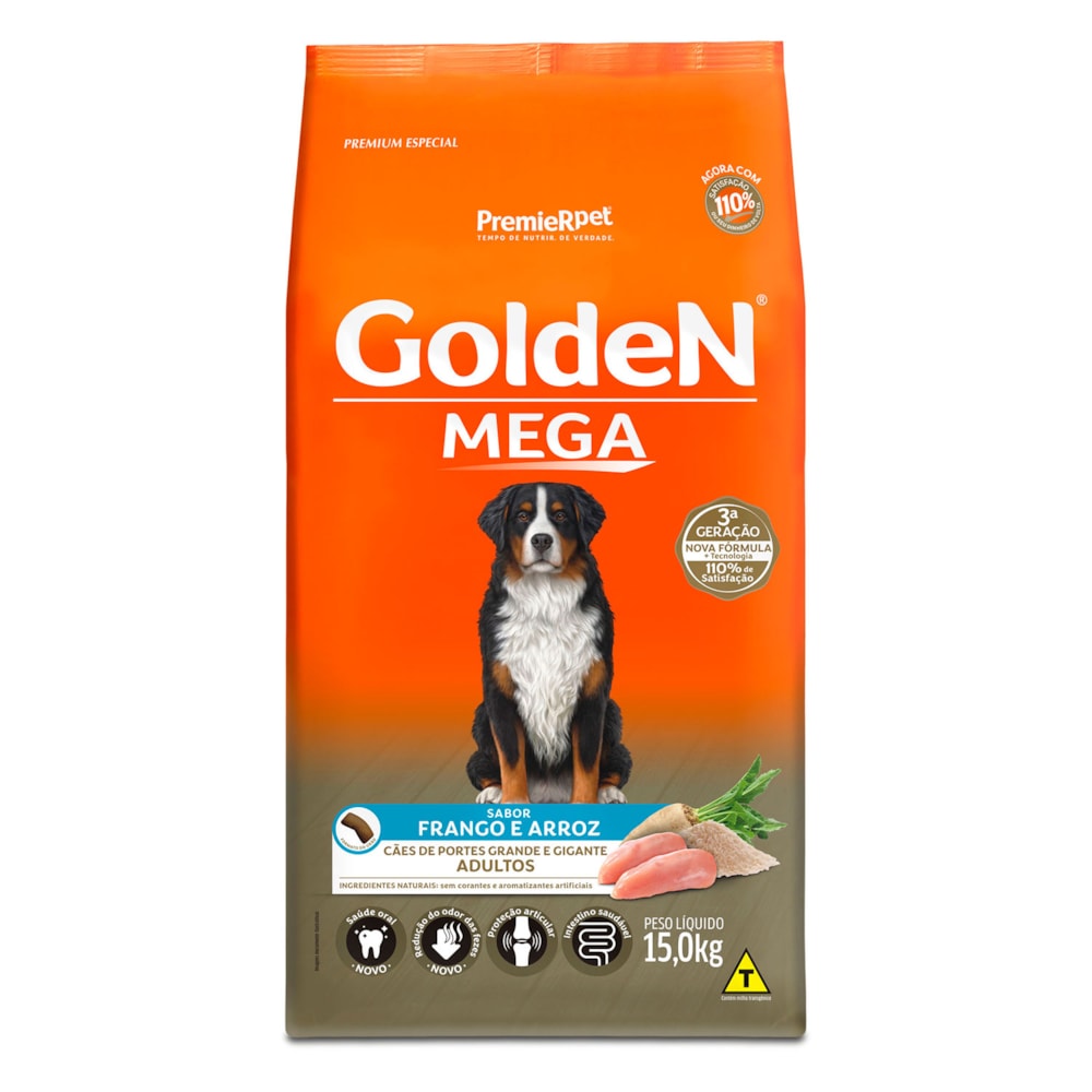 A Ração Golden Mega Adultos é um alimento Premium Especial desenvolvido pela PremieRpet® para cães de raças grandes e gigantes que pesam 30 kg ou mais. Utilizados para guarda e trabalho ou apenas admirados por seu porte e beleza, estes cães têm características próprias e necessidades especiais. As raças grandes e gigantes, por seu tamanho e estrutura, são mais predispostas a desenvolver problemas articulares. Além disso, frequentemente, apresentam fezes volumosas, pois possuem o aparelho digestivo curto, quando comparados a raças pequenas.