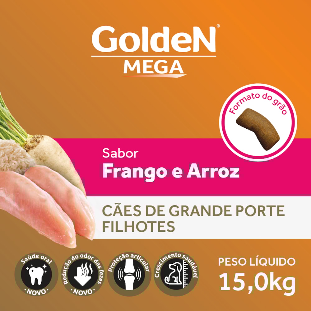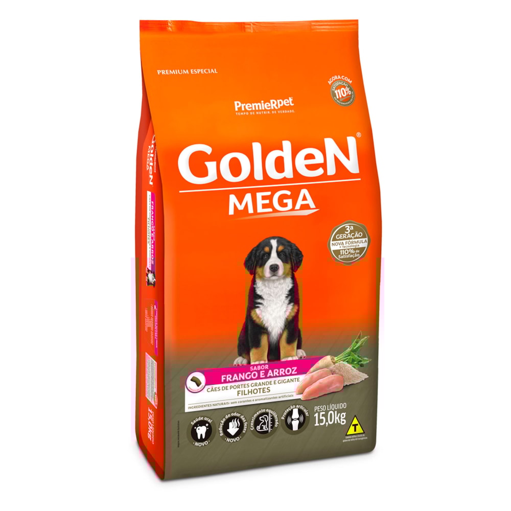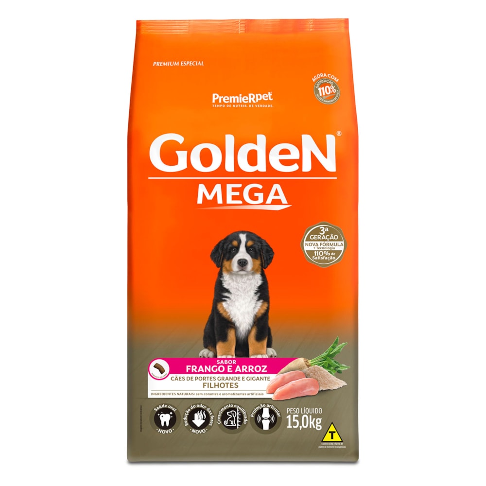 A Ração Golden Mega Filhotes é um alimento Premium Especial desenvolvido pela PremieRpet® para filhotes de raças grandes e gigantes que atingem 30 kg ou mais quando adultos. Esses cães apresentam um crescimento acelerado e só terminam seu desenvolvimento por volta de um ano e meio de idade. Nesta fase, qualquer deficiência ou excesso de nutrientes e energia pode trazer consequências sérias, como alterações osteo-articulares. Além disso, os cães de raças grandes e gigantes apresentam fezes volumosas, pois possuem o aparelho digestivo curto, quando comparados aos de raças pequenas.