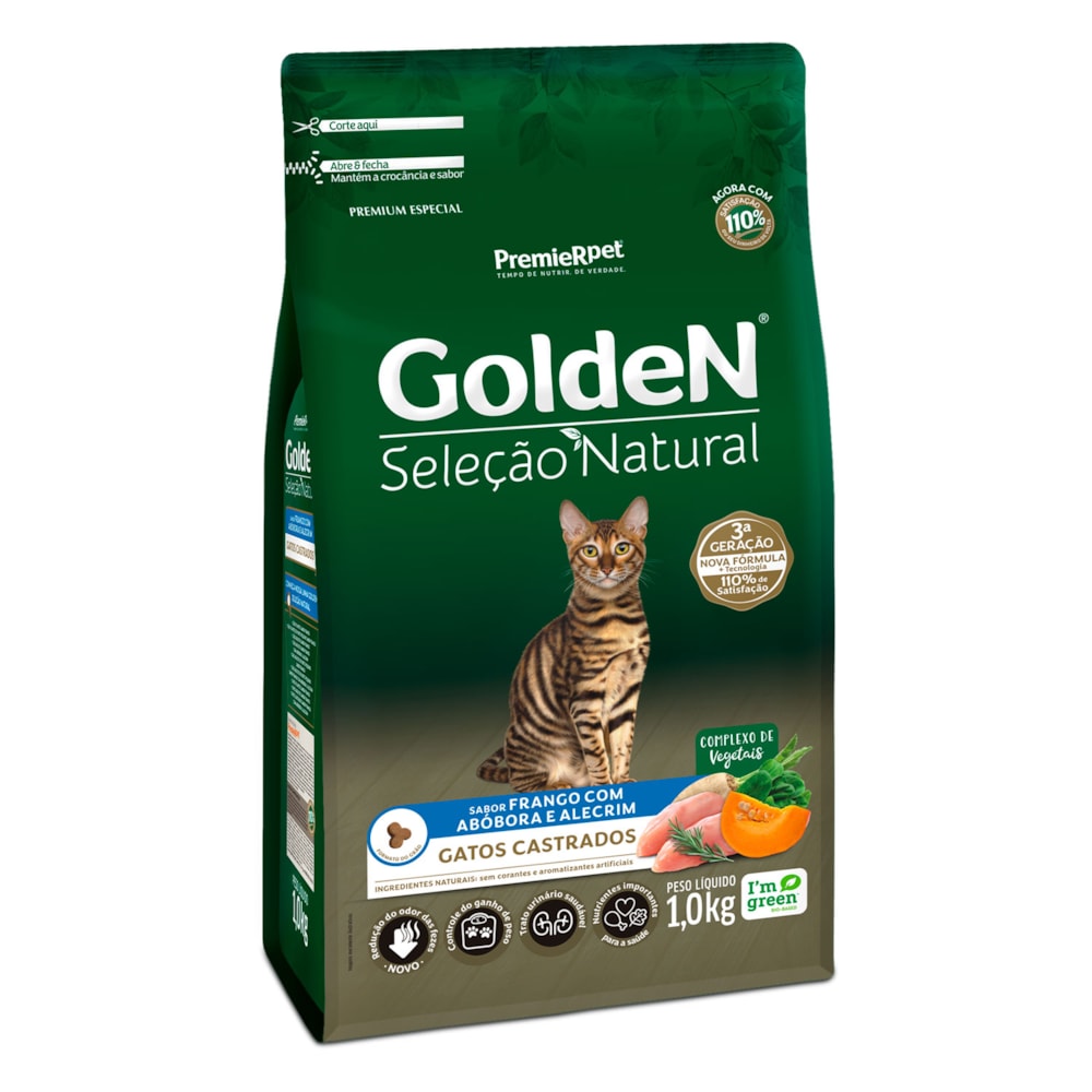 Contém nutrientes importantes para a saúde (ingredientes ricos em fibras e minerais), baixo teor de sódio para ressaltar o sabor natural dos ingredientes, sem corantes e aromatizantes artificiais e sem ingredientes transgênicos. Golden Seleção Natural Gatos Castrados Abóbora e Alecrim contém L-carnitina e teores reduzidos de calorias e gorduras para o controle de ganho de peso, além de minerais balanceados e controle do pH urinário para um trato urinário saudável.