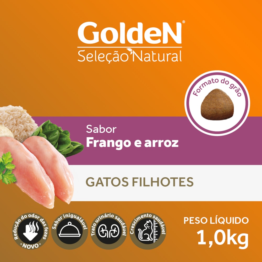 A Ração Golden Seleção Natural para Gatos Filhotes sabor Frango e Arroz é um alimento balanceado formulado para atender as necessidades dos pequenos felinos, desenvolvido com todas as vitaminas, nutrientes e substâncias que oferecem ótimos níveis de energia, proteínas e minerais, tudo que o seu gato precisa para viver de forma mais saudável. Com 33% de proteína, é indicado para gatos filhotes desde o desmame até 1 ano de idade. Sua fórmula contém Ômegas 3 e 6 e Zinco que ajudam a manter a pele protegida e reduz a queda de pelos, ainda possui a Taurina em sua composição para uma longevidade ativa e o complexo de 6 vegetais, como fonte de fibras e sais minerais, baixo teor de sódio para ressaltar o sabor natural dos ingredientes, sem corantes e aromatizantes artificiais e sem ingredientes transgênicos. A Ração Golden Seleção Natural para Gatos Filhotes sabor Frango e Arroz é enriquecida de Vitamina A, C, E, B12, K3 e D3 que facilitam a absorção e equilibram a demanda nutricional do seu gato,além de ter o DHA que estimula a capacidade de aprendizagem proporcionando mais vigor para as atividades do dia a dia.
