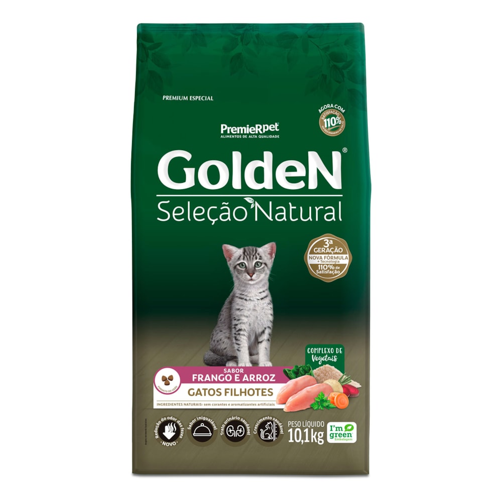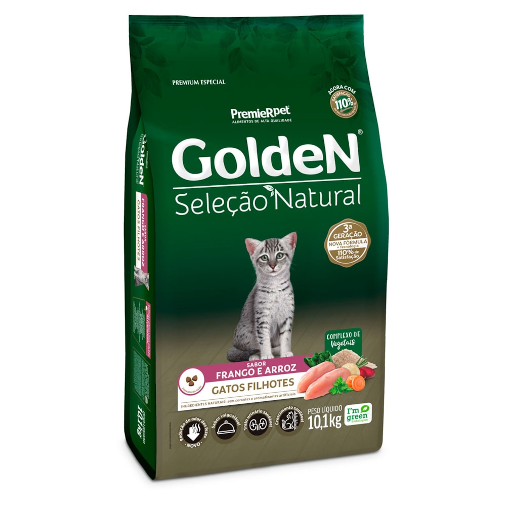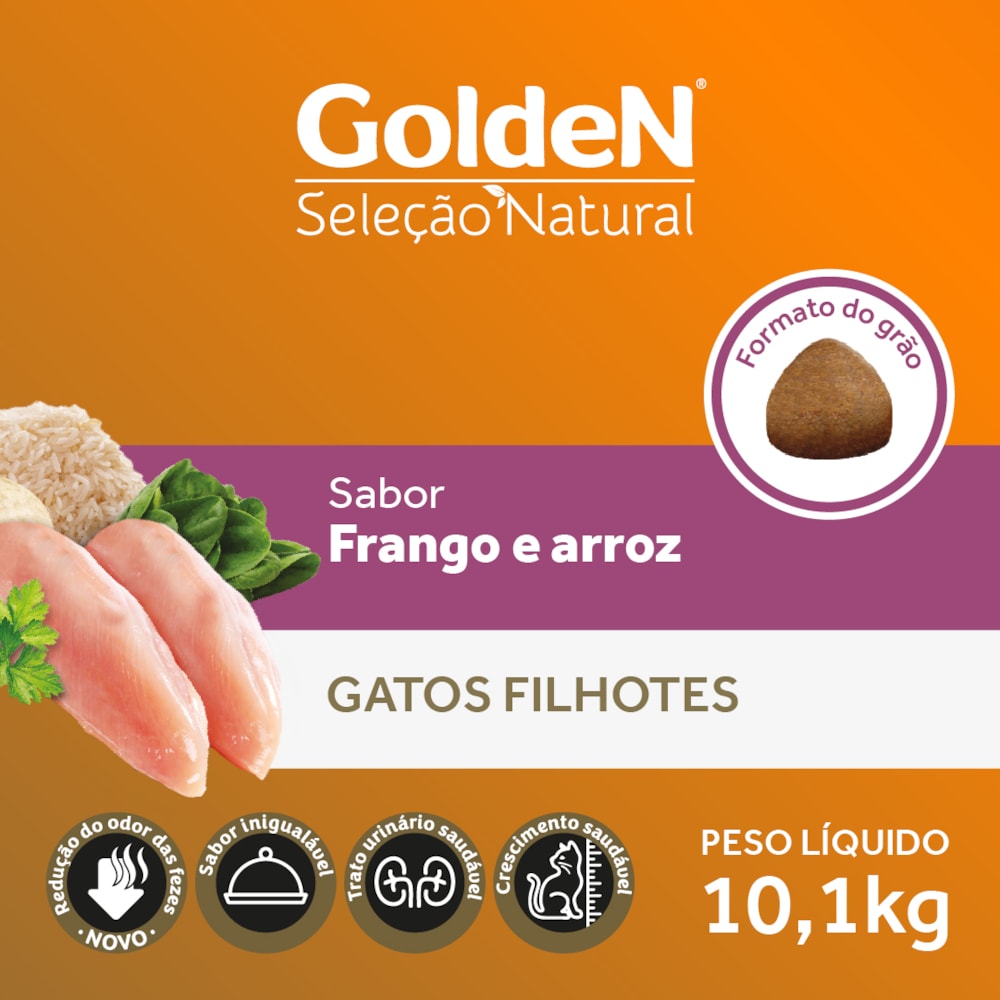 A Ração Golden Seleção Natural para Gatos Filhotes sabor Frango e Arroz é um alimento balanceado formulado para atender as necessidades dos pequenos felinos, desenvolvido com todas as vitaminas, nutrientes e substâncias que oferecem ótimos níveis de energia, proteínas e minerais, tudo que o seu gato precisa para viver de forma mais saudável. Com 33% de proteína, é indicado para gatos filhotes desde o desmame até 1 ano de idade. Sua fórmula contém Ômegas 3 e 6 e Zinco que ajudam a manter a pele protegida e reduz a queda de pelos, ainda possui a Taurina em sua composição para uma longevidade ativa e o complexo de 6 vegetais, como fonte de fibras e sais minerais, baixo teor de sódio para ressaltar o sabor natural dos ingredientes, sem corantes e aromatizantes artificiais e sem ingredientes transgênicos. A Ração Golden Seleção Natural para Gatos Filhotes sabor Frango e Arroz é enriquecida de Vitamina A, C, E, B12, K3 e D3 que facilitam a absorção e equilibram a demanda nutricional do seu gato,além de ter o DHA que estimula a capacidade de aprendizagem proporcionando mais vigor para as atividades do dia a dia.