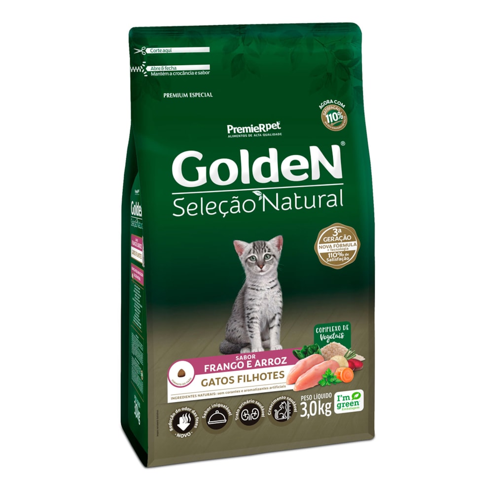 A Ração Golden Seleção Natural para Gatos Filhotes sabor Frango e Arroz é um alimento balanceado formulado para atender as necessidades dos pequenos felinos, desenvolvido com todas as vitaminas, nutrientes e substâncias que oferecem ótimos níveis de energia, proteínas e minerais, tudo que o seu gato precisa para viver de forma mais saudável. Com 33% de proteína, é indicado para gatos filhotes desde o desmame até 1 ano de idade. Sua fórmula contém Ômegas 3 e 6 e Zinco que ajudam a manter a pele protegida e reduz a queda de pelos, ainda possui a Taurina em sua composição para uma longevidade ativa e o complexo de 6 vegetais, como fonte de fibras e sais minerais, baixo teor de sódio para ressaltar o sabor natural dos ingredientes, sem corantes e aromatizantes artificiais e sem ingredientes transgênicos. A Ração Golden Seleção Natural para Gatos Filhotes sabor Frango e Arroz é enriquecida de Vitamina A, C, E, B12, K3 e D3 que facilitam a absorção e equilibram a demanda nutricional do seu gato,além de ter o DHA que estimula a capacidade de aprendizagem proporcionando mais vigor para as atividades do dia a dia.