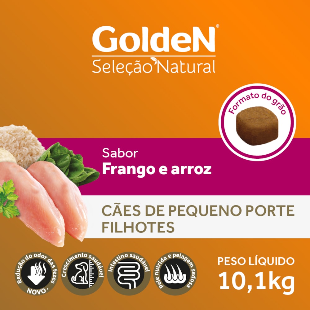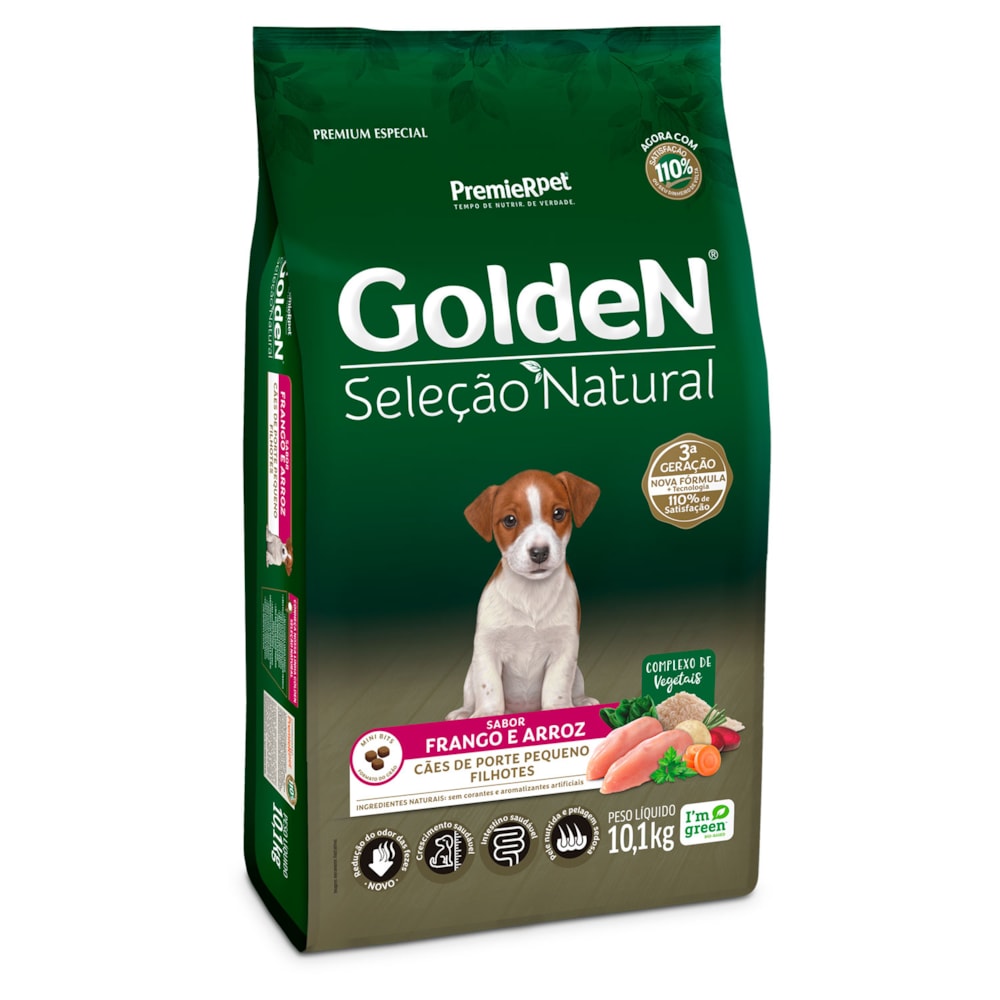A Ração Golden Seleção Natural Mini Bits para Cães Filhotes Raças Pequenas sabor Frango e Arroz é um alimento completo desenvolvido com todas as vitaminas, nutrientes e substâncias que o seu cão precisa para viver de forma mais saudável e com uma pelagem sempre bonita! Com 27% de proteína, é indicado para cães filhotes de pequeno porte desde o desmame até a idade adulta. Sua fórmula contém Ômegas 3 e 6 e Zinco que ajudam a manter a pele protegida e reduz a queda de pelos e ainda possui DHA que estimula a capacidade de aprendizagem. As proteínas da Ração Golden Seleção Natural Mini Bits para Cães Filhotes Raças Pequenas sabor Frango e Arroz são de altíssima qualidade resultando em alta palatabilidade e os níveis de calorias e gorduras são reduzidos. Sua composição também é enriquecida de Vitamina A, C, E, B12, K3 e D3 além do Complexo 6 vegetais que facilitam a absorção e equilibram a demanda nutricional do seu cão, proporcionando mais vigor para as atividades do dia a dia.